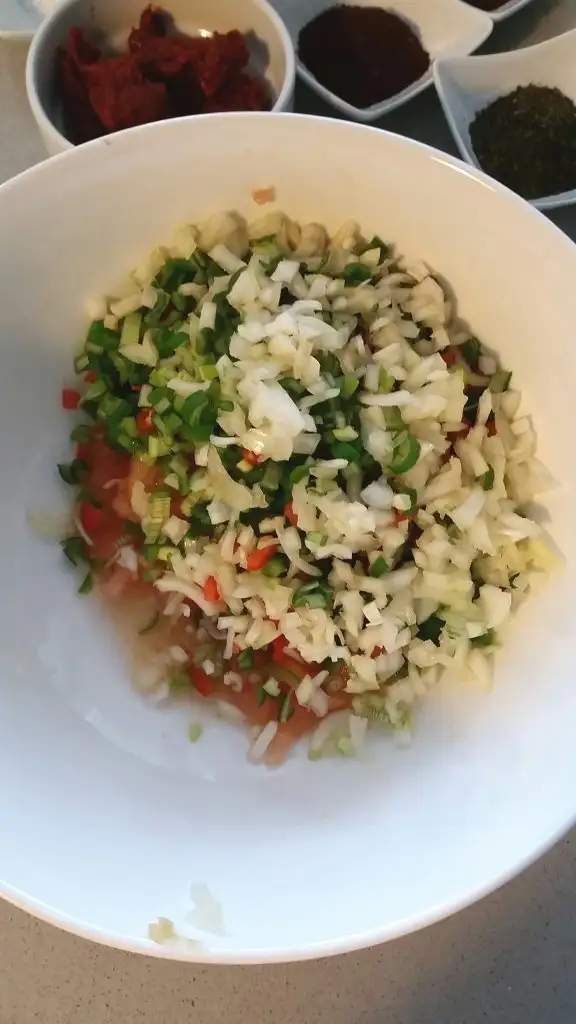 Domates biber ve soganlari minik minik dogruyoruz ve diger tum malzemelerle karistiriyoruz