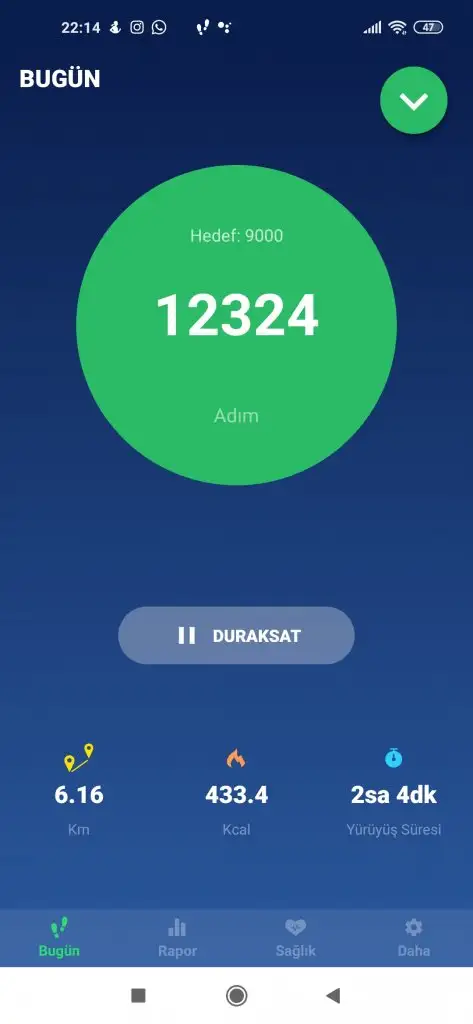 Bu program bende çalışmıyor sanırım dün kurdum diğeri ile 2 saat yürüdüm tempolu 12bin üstü adım saydi ama sendeki. Uygulamada 1.978 adim gösteriyordu ayar filan yapamadım varmı ayar bilmiyorum tekrar sildimYıkılmadım ayaktayımVe daha burda saat 5buçuk.