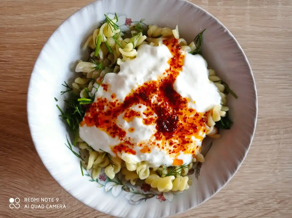 Aksam 18.5 yedim dayanamadım 🙈 dereotlu makarna samirsakli yoğurt acı soslu 4-5 çorba kaşık
