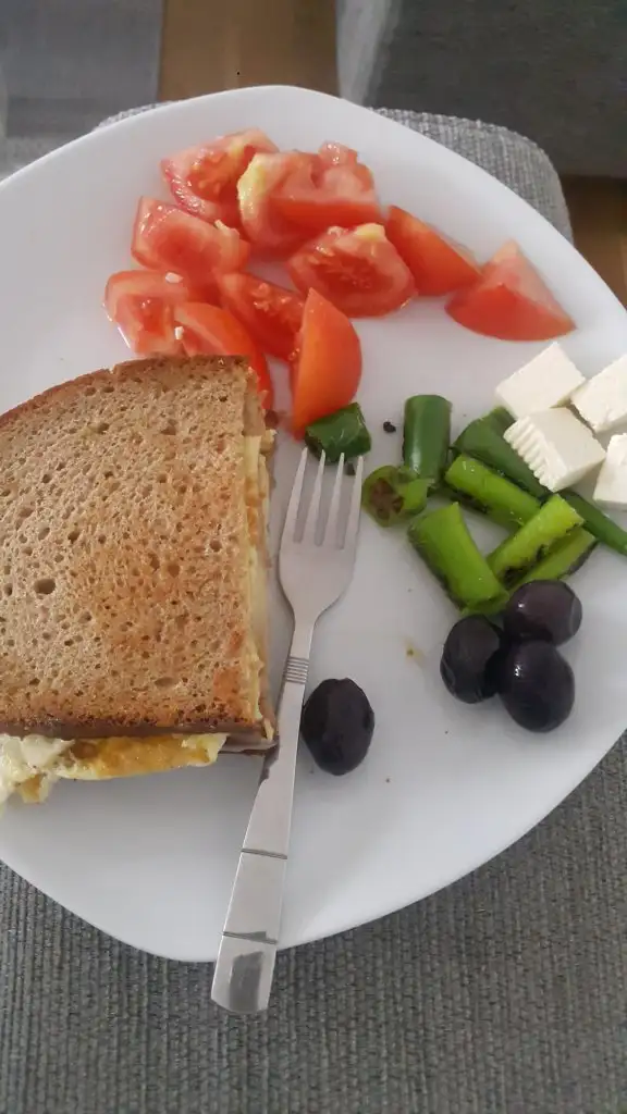 Sabah — 1 haşlanmış yumurta, biraz beyaz peynir, 3 zeytin, domates, yarım dilim ekmekle biraz tahin pekmez yedim
