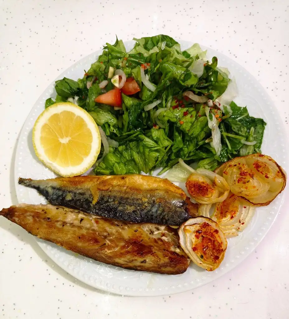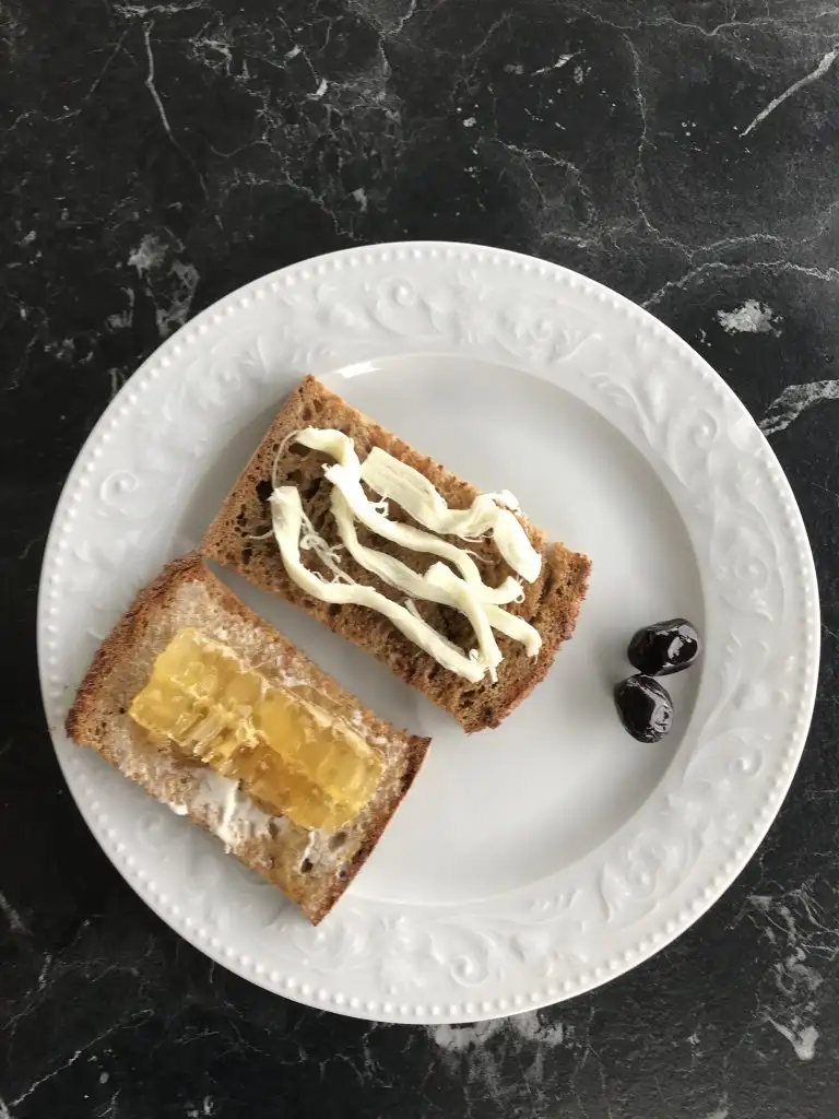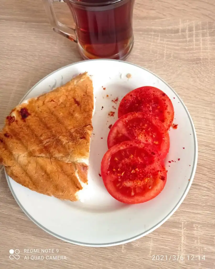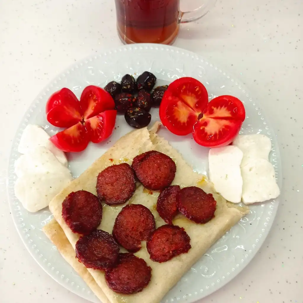 Domates salatalik peynir zeytin bi kasik sucuklu yumurta 2 dilim yumurtali ekmek.