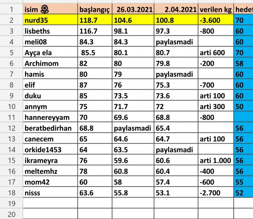 Tebrikler canım az diye üzülmek yok bol eksiler olsun her hafta 500 versek kar yağdan da veriyoruz incelme yaşanıyor 25 kilo superrr harikasınKızlar az verdim diye üzülmüştüm bugün ama kalori saydığım uygulamadan gördüm ki bugün tam 25. kilomu vermiş bulunuyorum dile kolay...Birden motivasyonum tavan yaptı