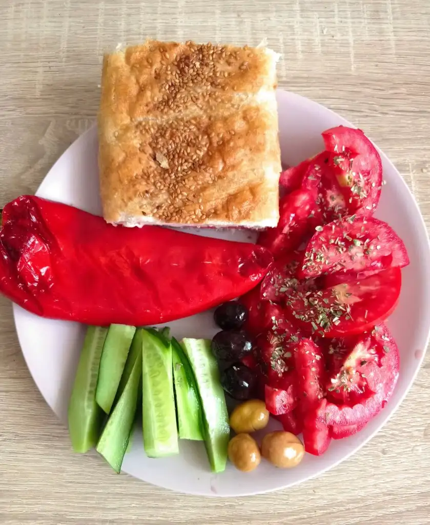 Bugun de sabah 11.00 1 yumurta ile melemen yarim domates salatalık peynir 7 zeytin küçüktü cok.