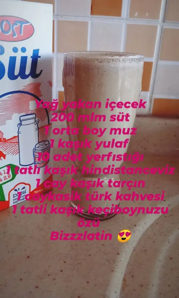 Ara öğünlerde içtiğim bir icecektir spordan 1-45 dkk önce içildiğinde yağ yakımı oluyor.badem ceviz ne varsa vs vs olur
