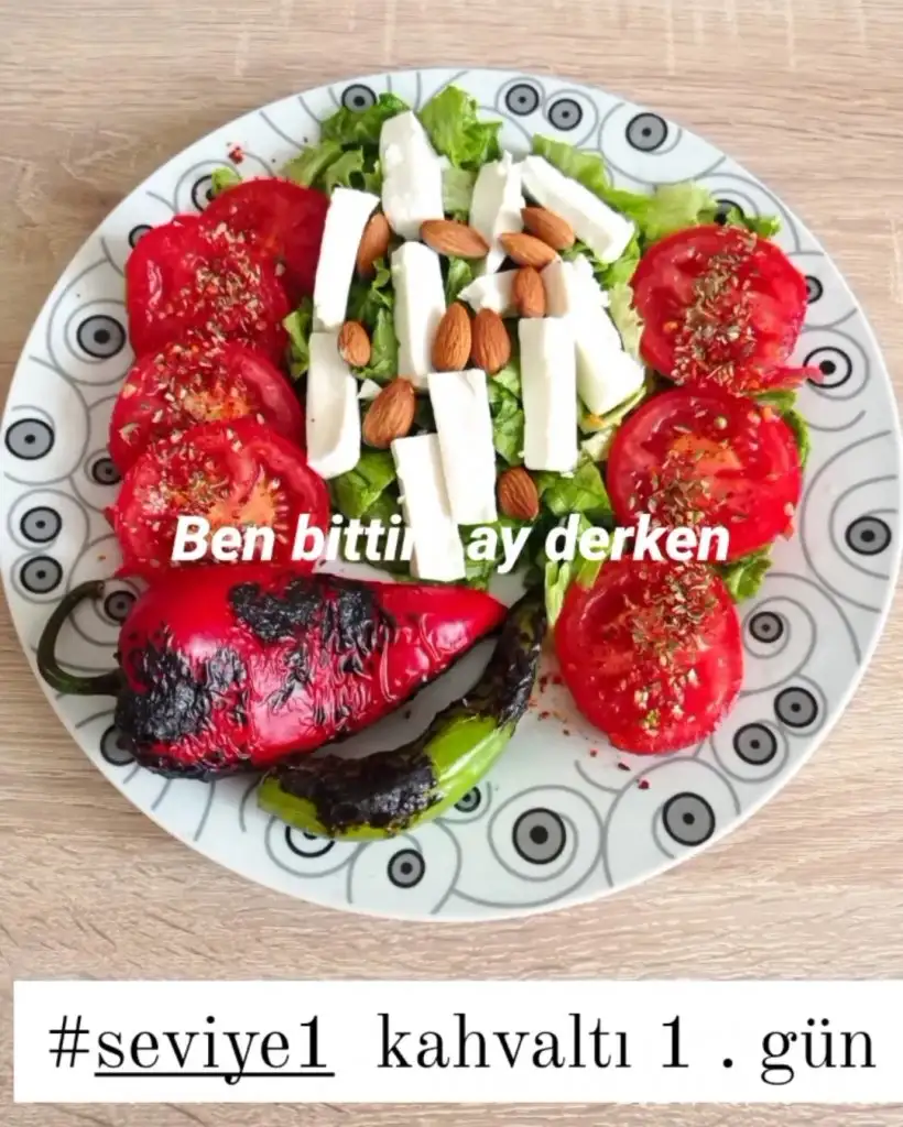 Öğlen : 2 yumurtayla yağsız menemen,25 gr yağsız beyaz peynir,1 dilim tam buğday ekmeği