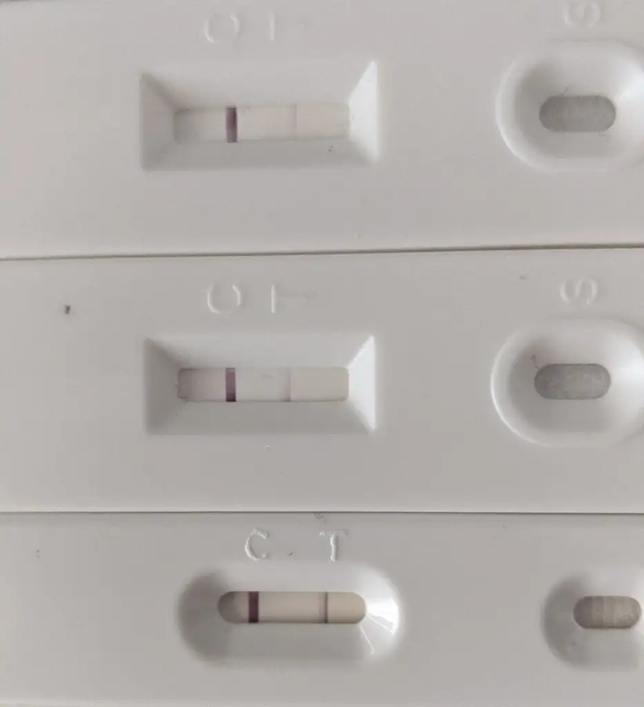 Evet ben her gün yapıp koyulaşmasını izlemiştim. Ama 5. günü aşırı silikti zor görünüyordu ama yine de görünüyordu. Tam net kırmızı olması 12. günden sonraydı. İlk fotoğraf yukarıdan aşağıya doğru 5,6 ve 7. günler bu şekildeydi. Zaten 7. günü de kan testi verdim 92 ile öğrendim. Bu arada bunlara bakıp aynı koyulukta bekleme çünkü bunlar beklemiş test o yüzden daha da koyulaştı, ilk yaptığımda bu kadar belirgin değillerdi. Ikinci fotoğrafta 12. günü tam net kırmızıydı