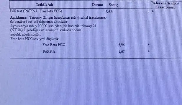 Merhaba arkadaşlar lütfen yardımcı olabilecek biri varsa çok sevinirim. Ablam bugün test için gitti doktor ile moral bozucu bir görüşme yapmış. Bebeğin down sendromlu olma ihtimali varmış oranlar aşağıdaki gibi yardımcı olursanız bilgi verirseniz minnettar kalırım. Oranlar ihtimaller öneriler açıkçası Şuan kendi çok korktu çok panik bu yoldan geçmiş bilgisi olan biri dönerse çok sevinirim 🙏🏻🌸