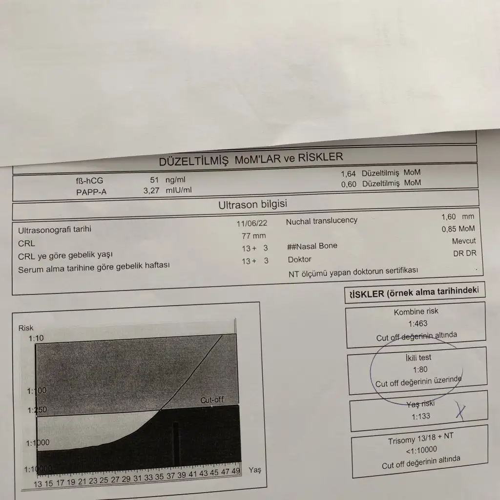 Merhabalar 33 yaşındayım ilk gebeliğim bugün ikili tarama sonucunu öğrendik ve doktor riskli dedi ama ultrason da baktığında sorun yok dedi ama çok endişeliyim böyle olan var mı acaba amniyosentez ya da DNA kan testini önerdi ve ikili tarama testi riskli çıktığı için üçlü ve dörtlü yapılmıyor dedi 😐 test sonucunu yükledim bakıp yorum yaparsanız içimi bir nebze de olsa rahatlatırsınız tabi ki herşey Allah'tan aldırmayı düşünmedim bile fakat insan yine de kötü oluyor