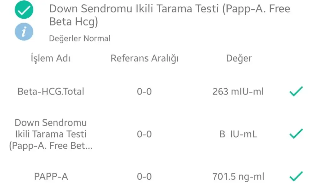 Arkadaşlar 13 haftalık hamileyim ikili tarama testi verdim sonuçlar böyle çıktı ama anlamadım doktora gitmemize de daha var. Yani endişeleniyorum açıkçası. Anlayan bakabilir mi bir sorun var mı? Kendi kendimi yiyorum yiyip bitiricem vallahi..