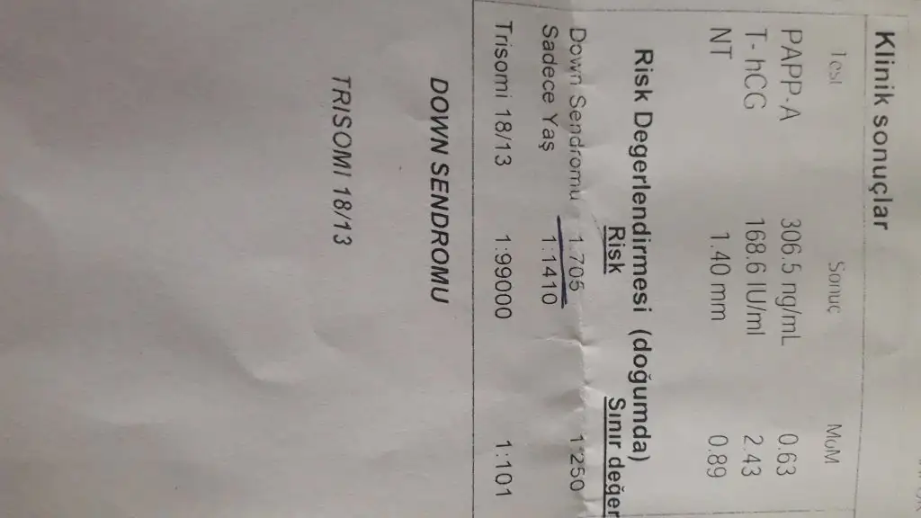 Merhaba bugün ikili tarama testimin sonucunu aldim. Benim icin cok yıkıcı geldi. Degerim 1/705 cikti hafif orta riskli dedi doktorum ense kalınlığı 1.40 cikti. Lutfen bana iyi biseyler söyleyin çok ihtiyacım var. Böyle sonucu gelip sonrasında hersey yolunda giden var mi? Riskli gebelik uzmani korkuttu ama kendi kadin doğum doktorum üstünde bile durmadi hafif orta risk görünüyo abartilcak kadar degil dedi. Bu arada devlete gidiyorum özele gidip tekrar ayrıntılı incelememi istesem yardımcı olur musunuz?????