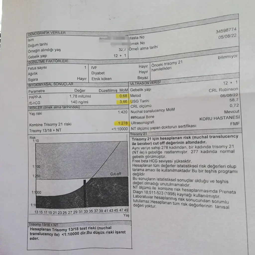 Sizşn risk sonucunuzda umut verici taraf riskiniz çok yüksek görünmüyor ama ikinci resimde biyokimyasal risk 154 gibi birşey yazıyordu sanırım.. Yani sadece Kanınıza bakılırsa risk artmış gibi.. Ama totalde orta riskli bir sonuç görünüyor..