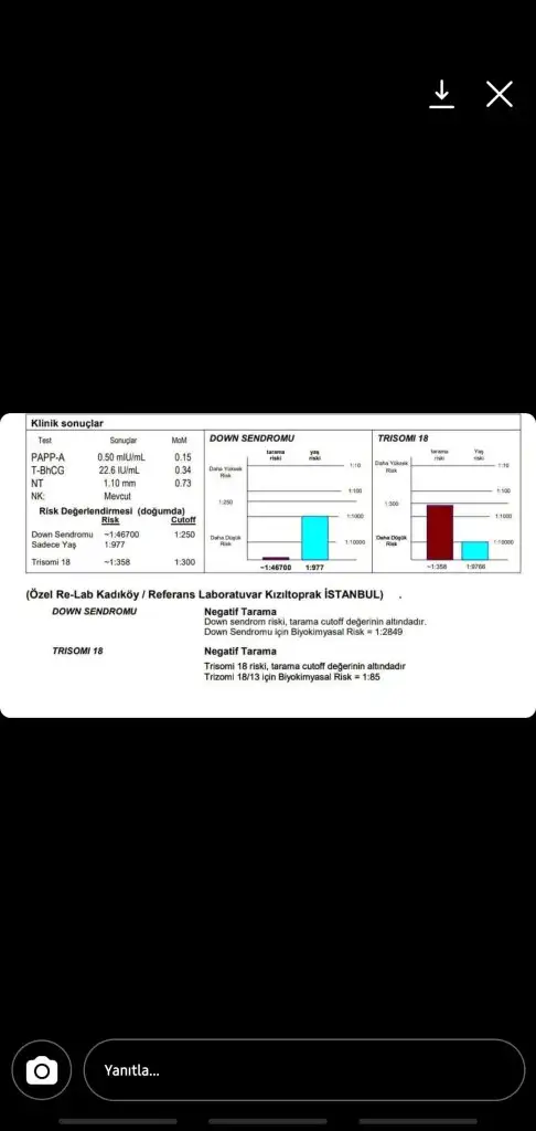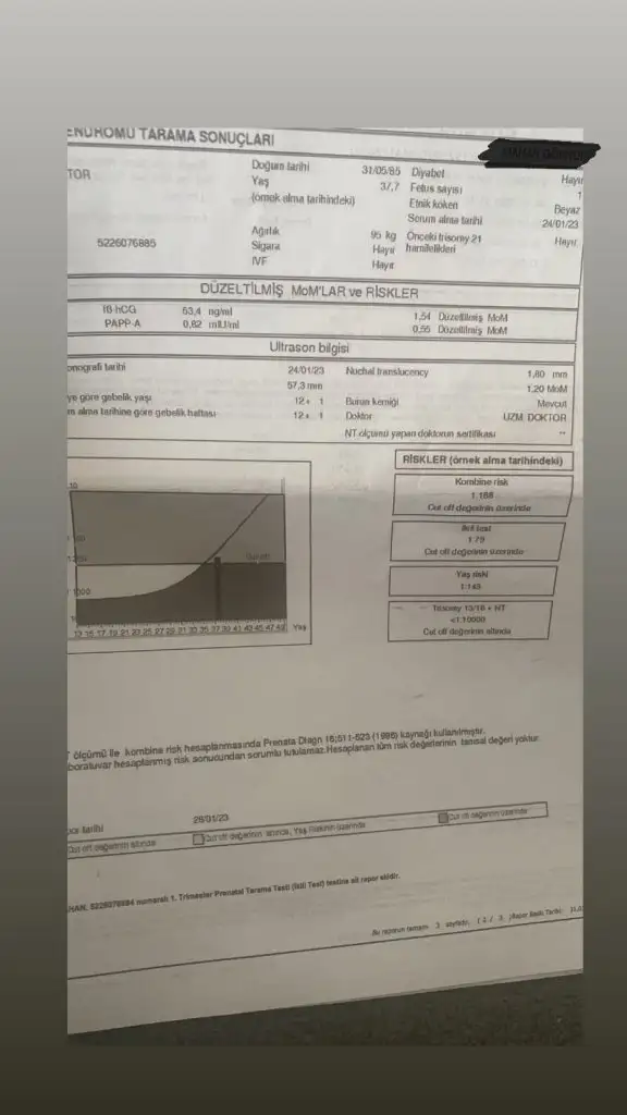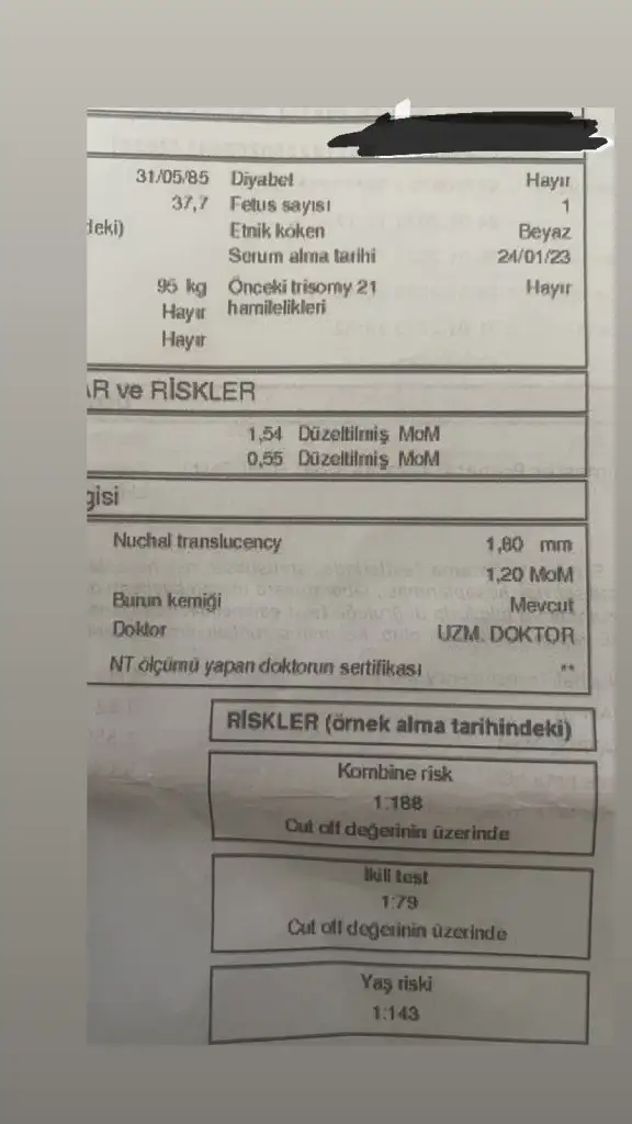 Merhabalar, gectigimiz hafta ikili test yaptirdim ultrasonda ense kalinligi burun kemigi ve diger tum detaylar normal cikti ancak kanda trizomi18 riskimin yuksek ciktigini ilettiler. Yasiminda genc olmasi dolayisiyla riskin mutlaka degerlendirilmesi gerektigini ve fetal dna testi yaptırmami soylediler ornek verdim sonucu bekliyorum ama 15 gun suresi var oldukca gergin ve üzgünüm . Fetal dnanin da pozitif cikmasi durumunda gebeligin yuksek oranda kayipla sonuclanacagini ongoruyorlar. Aranizda bu gibi ultrasonda sorun yasamamis ancak kanda riski yuksek cikipta sonradan temize donen varmi yardimlarini rica ediyorum testimin fotografini da iletiyorum