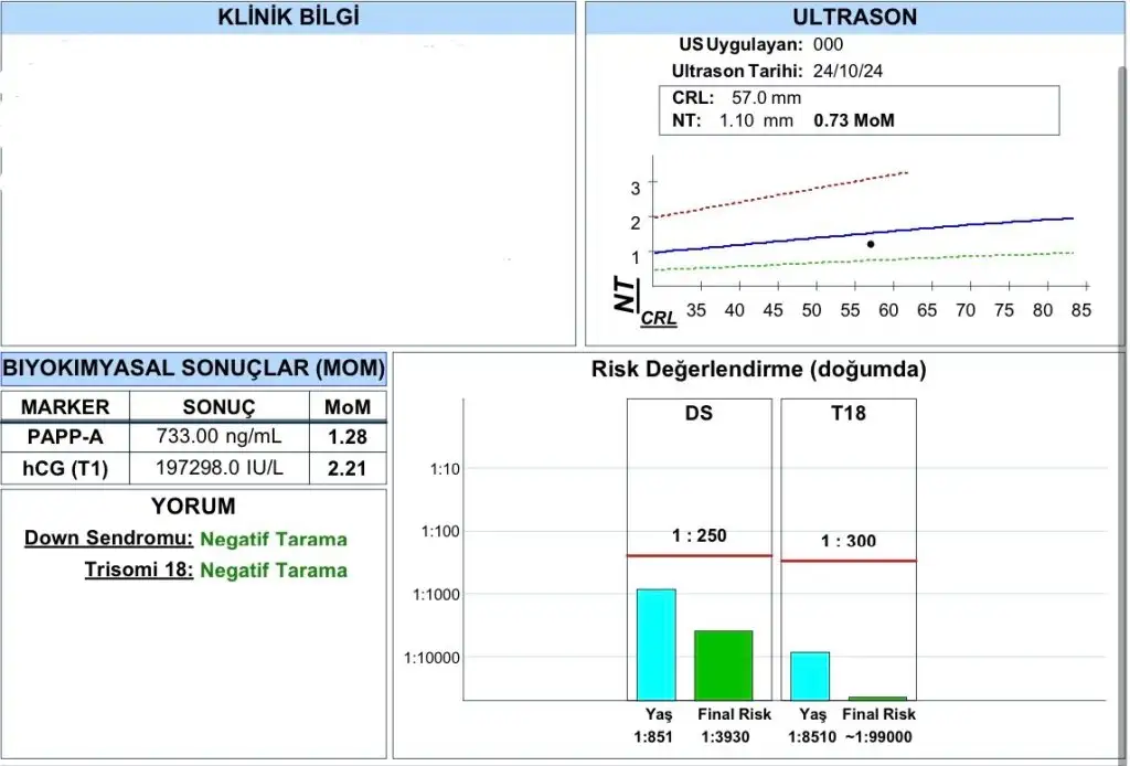 Down Sendromu (Trizomi 21): Sonuç "Negatif Tarama" olarak değerlendirilmiş ve final risk oranı 1:3930. Klinik olarak kabul edilen sınır (1:250) üzerinde, bu nedenle risk düşük.
