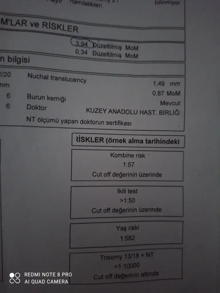 Merhaba, 13+6 da ikili test yaptırdım, ultrason gayet normaldi ancak kan sonucu kombine risk 1:57, ikili test: <1:50, yaş riski 1:582 Trisomy 13/18 +NT <1:10000 oranında Down sendromlu çıktı (yani 57 kadından biri), tabi testlere güven olmuyor o yüzden doktorumun tavsiyesi üzerine amniyosentez için randevu aldım, bebeğimi aldırmak için değil bu testi yaptırmam, sadece kendimi ve yaşantımızı buna göre ayarlamak için testi yaptırma kararı aldırdım, 33 aylık bir oğlum var, onda da kolestaz gebelik şekeri gibi gebelik rahatsızlıkları geçirdim ancak onda ikili testim temiz çıkmıştı, daha amniyosentez yaptırmama 3 hafta kadar var, benim sorum şu olacak daha önce benim test sonucu aralığım gibi sonucu çıkan var mı, varsa amniyosentez yaptırdınız mı, yaptırdınız ise sonucu ne çıktı? Sabahtan beri araştırıyorum bir sürü konu okudum, yine de bir konu açıp size danışmak istedim. Umarım bu kadar uzun olması okunmasını engellemez. Lütfen biri yardım edebilir mi?