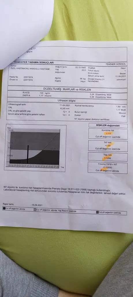 Ense kalınlığı yok güzel. Burun kemiğide gözlenmiş bunler güzel şeyler. Ama kan değerleriniz sıkıntılı çıkmış. Free beta yüksekliği var ama bundanda önemli riski yükselten papp a mom değerinin 0.50 altında olması. Tabiki böyle olup sağlıklı doğum yapanda çok kişi var ama insanın içine kurt düşüyor bir kere. Fetal dna için kan verdiniz mi yaptıracakmısınız nifty testi