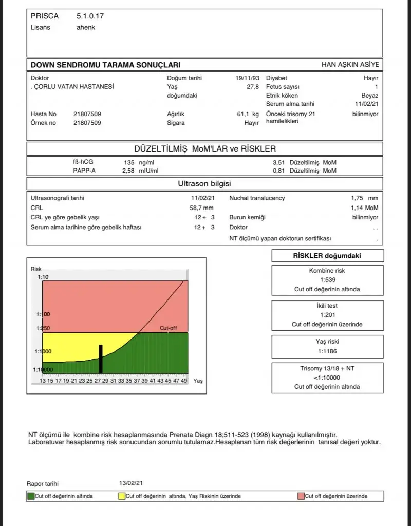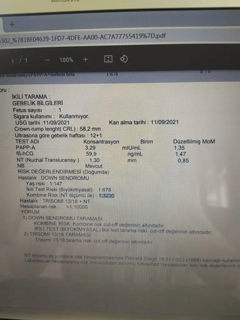 İkili tarama testinde sonuçlarım papp a değerim : 21.9 (mom 0.82) free bhgc değerim:62.2(Mom 1.64) bu değerlerle down riski bebekte 120/1 çıkmış . Yaş 38 kilo 83 etkilemiş olabilir mi sizlerde ne çıktı acaba ?