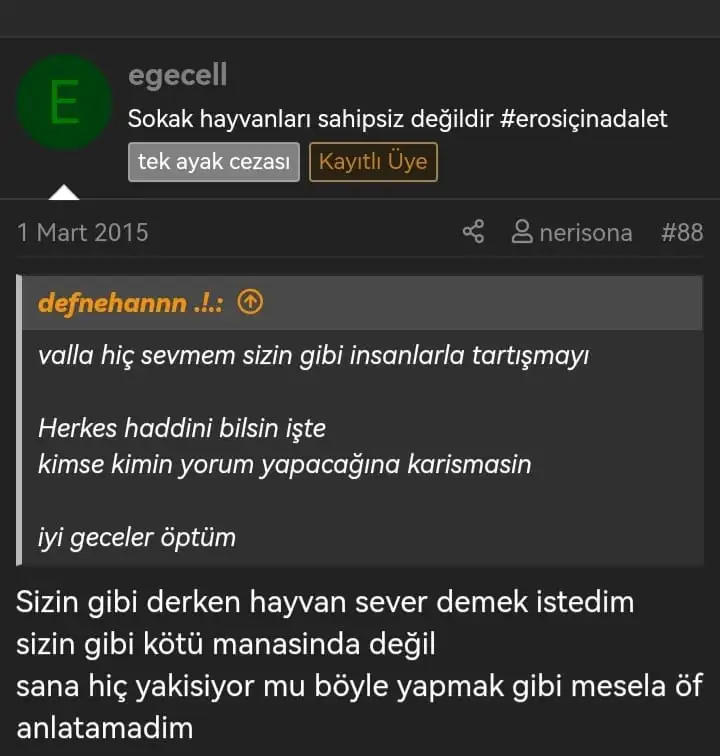 Şimdi asıl mesele ne neyi anlatmaya çalışıyorsun tam olarak? Defnehanin egecel oldugunu nerden anladin?Defnehan kendisinin eski nicki ve tüm paylaşımları oradan yapıp, ardından egecell'e dönmüş. Bu konularda da hayvanları savunan insanlara çatmış. :)))