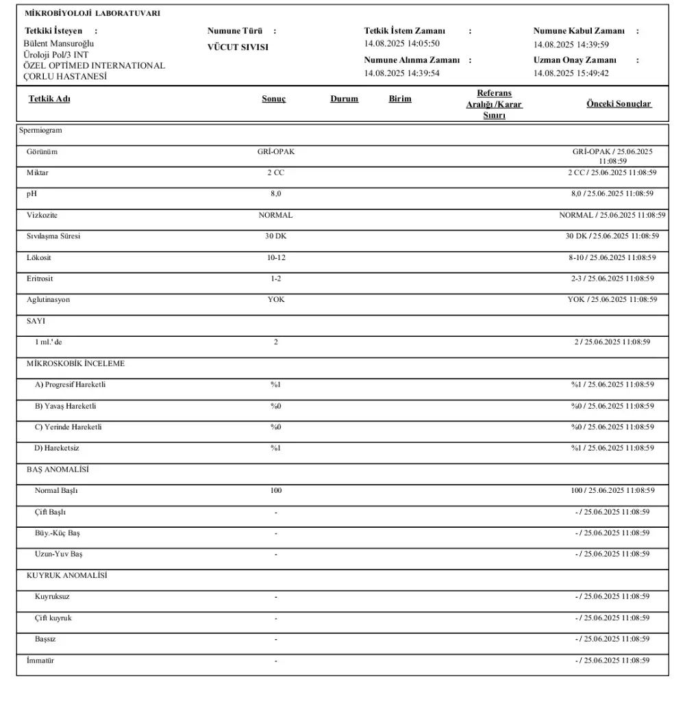 yakın zamanda eşim de bu testten yaptırdı, ve ekstra kruger testi de verdi. eşim de ben de hemşireyiz az cok konuya hakimiz ben yaptırdıgınız testi detaylı bulmadım bence farklı bir hastanede özellikle devlet hastanesinde vermenizi tavsiye ederim.ekte eşimin sonuclarını atıyorum kıyaslamanız adınaEşim aynı klinikte tektar test verdi aynı çıktı. Önceki sonuçları da sağ tarafa yazmışlar. Sadece lökosit artmış. Şimdilik chatgptye sorduğumda enfeksiyona yoruyor. Ayrıca eşim miktara 2CC ve 4 milyon diyor ama ml de 2 yazıyor sadece 2 milyon sperm olduğu anlamına gelmez mi?
