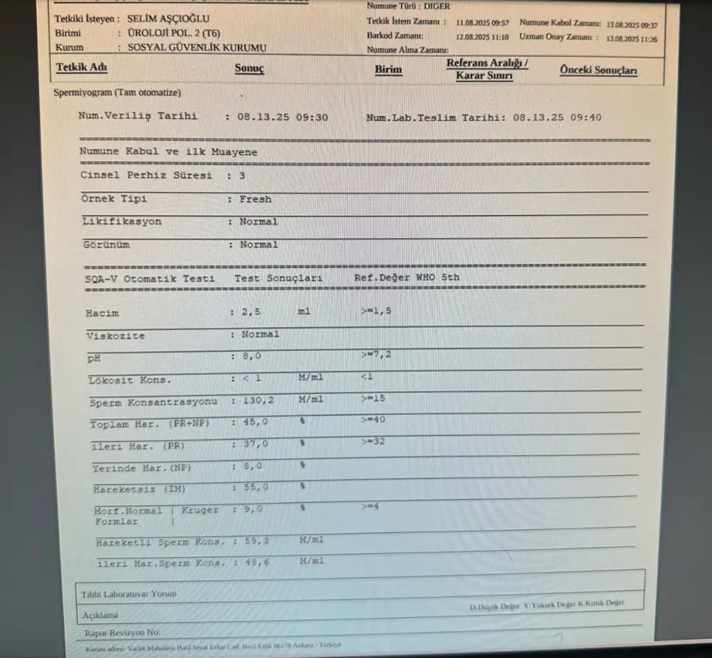 İlk sefer de devlete gittik ama tamamen boştu. Sperm sayısı bile çıkmadı. Daha sonra Araştırmaya gitti eşim ve doktor özelde tekrarlanmasını istedi. Oradaki sonuçlar böyle. Ve araştırma hastanesine sonuç göstermeye bir kaç defa gittik beraber. Gidiş dönüş sadece üç saat sürüyor ve görüşemeden döndük. İki defa dediki bir sonraki gelişinizde ilk sizi alacağım almadı. Araştırmadan umudumuzu kestik. Haftaya şehir hastanesine randevu aldı eşim şimdi orada dediğiniz gibi yapalım.