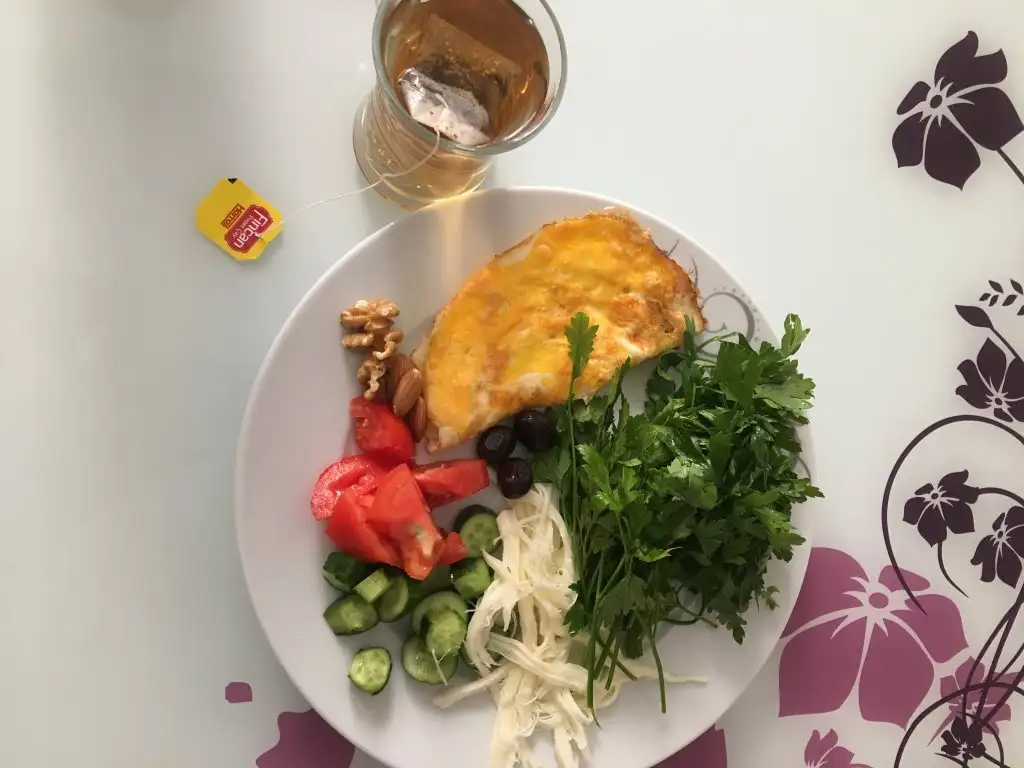 Kahvaltım peynirli yumurta 1 yumurta ile dereotu maydanoz domates salatalık şekersiz çay ekmek yok:super: