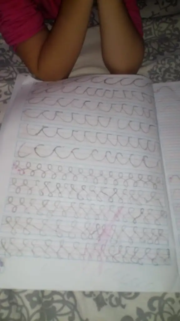 Dün akşam 2.5 sayfa ( yarım sayfayı okulda tenefüse cıkmadan yapmış) birde defterde 1 sayfası vardı m gibi bişeydi birleşik yine onun yarısını yapmış ve silmiş izleri vardı neyse. Babası 1 sayfa çizgi calısmasını yaptırdı 15 dakikada ve sonra oyuna bıraktık onu yaklaşık saat 8 kadar diyebilirim, Dün akşam