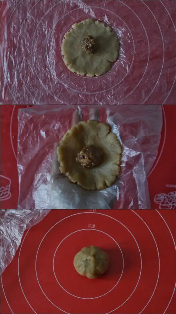 - Naylonun uçları birleştirilerek kapatılır. Kurabiye hamurunun kenarları bir araya getirilip elle hamurun ağzı birleştirilir ve incir şekli verilir.