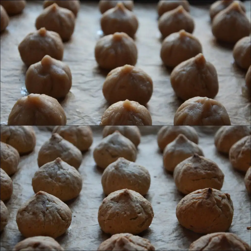 10. Üstü kızarana kadar (yaklaşık 20 dakika) pişirilir. Tecrübesiz olanlar sivri kısmının ve kurabiyenin altının kızarmasını baz alabilir.