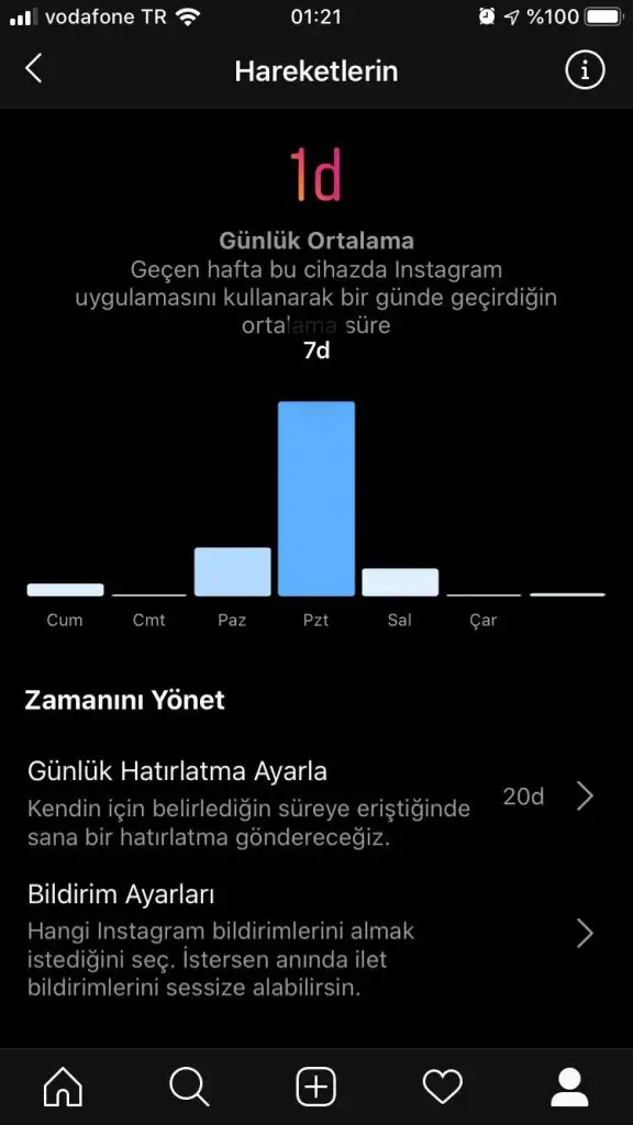 Kızlar eşimin günlük instagram süresine baktım arkadaşlardan birine yazdım ama güncelleme olarak da eklemek istedim bir tek ptesi günü 7 dk gerisi bir iki dakka ortalama 1 dk çıkıyor hatta (yoğun çalışıyor zaten biliyorum bir de evde telini nadir kullanır)