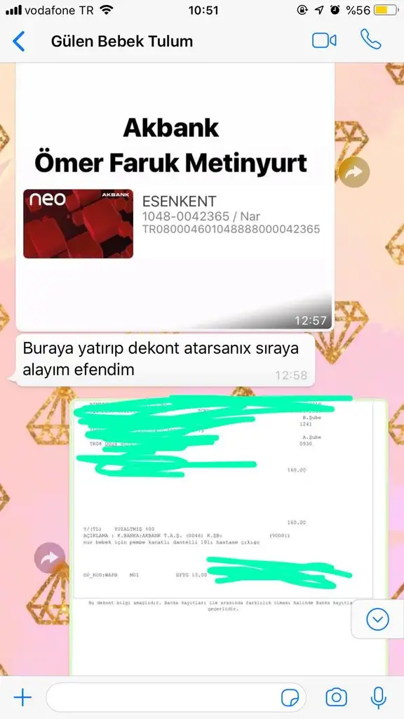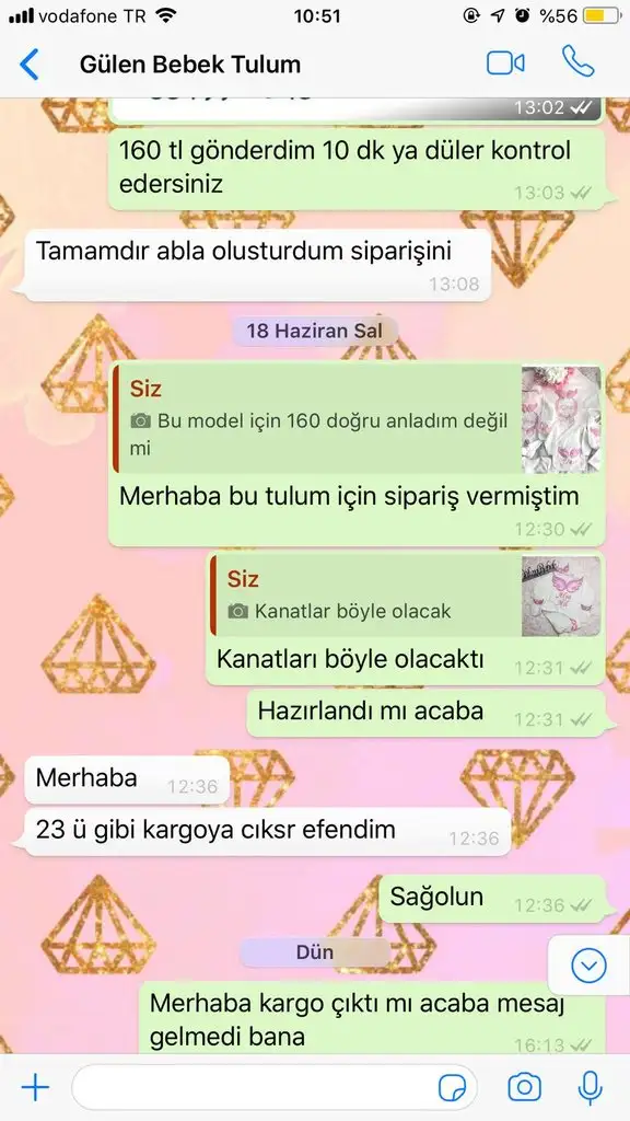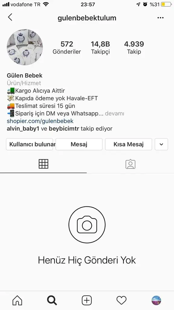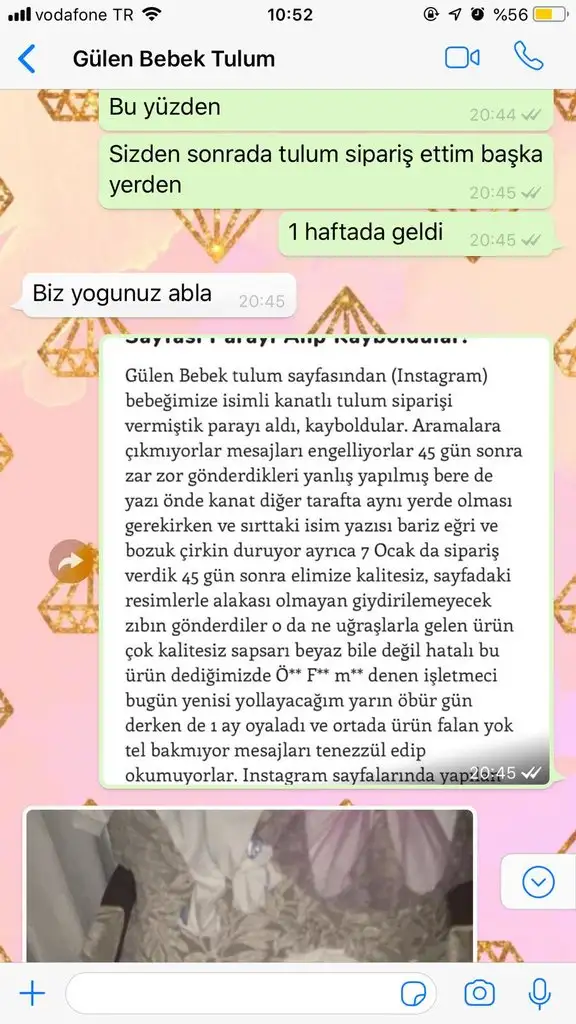 instagramdan gülen bebek tulum adlı sayfadan 05536869178 NOLU NUMARADAN 160 tl lik sipariş verdim. ÖMER FARUK METİNYURT adına AKBANK ESENKENT ŞUBESİNE ödemeyi EFT ile yaptım. Gönderim süresi sayfada 15 gün yazmasına rağmen göndermediler. İnternetten sayfa adını aratınca başka kişilerinde mağdur olduğunu gördüm. resimlere başka şikayetlerden örnekler koyuyorum. Satıcıya sorduğumda hastayım erteledim dedi. 1 hafta sonra tekrar sordum. pazartesi çıkacak dedi. instagrama yorum olarak siparişim 21 gün geçti göndermediniz yazdım bir çok kere yorumları dakikasında siliyorlar. yorum silmede gösterdiğiniz mesaiyi ürün hazırlamada harcasanız keşke. bir keresinde yorumuma başka bir kişi benimde 25 gün oldu göndermediler yazmış dakikasında sildiler ben cevap yazamadan sonra beni engellediler. whatsapptan seni engelledim ortalığı karıştırmanı bekleyemem sürekli yazmış.yazışmanın resmini koyuyorum. parayı göndermeden önce efendim diyen adamlar parayı alınca senli benli oldu. cimer e yazdım. tüketici hakem heyetine de dilekçe vericem. sanırım tam doğum arifesi kimse uğraşamaz diyerek insanları dolandırıyorlar. ama başkalarını da dolandırmanıza izin vermeyeceğim. sayfa o kadar güvenilir gözüküyor ki yorumlara açık (sürekli silinse de kötü yorumlar), yüksek takipçili, arada memnuniyet falan diye paylaşımlar. er yada geç o parayı yada ürünümü alıcam sizden. Defalarca instadan alışveriş yaptım böyle saygısız usluplu konusan, eft alıp ürün göndermeyen görmedim. Parayla rezil olmak bu hakkım haram olsun yemek nasip olmasın Ahlaksızlara..... resimlerden konuşmalara bakabilirsiniz.
