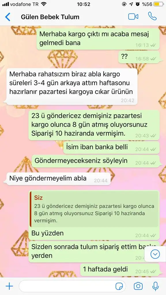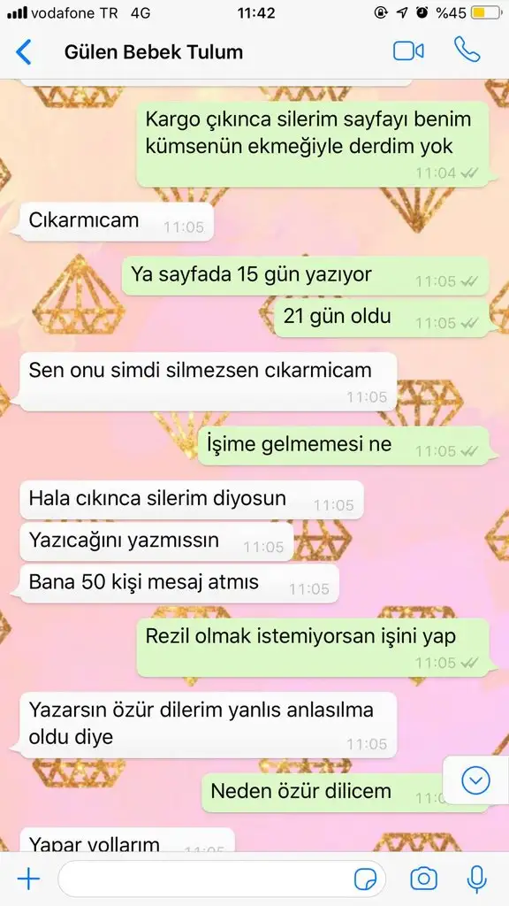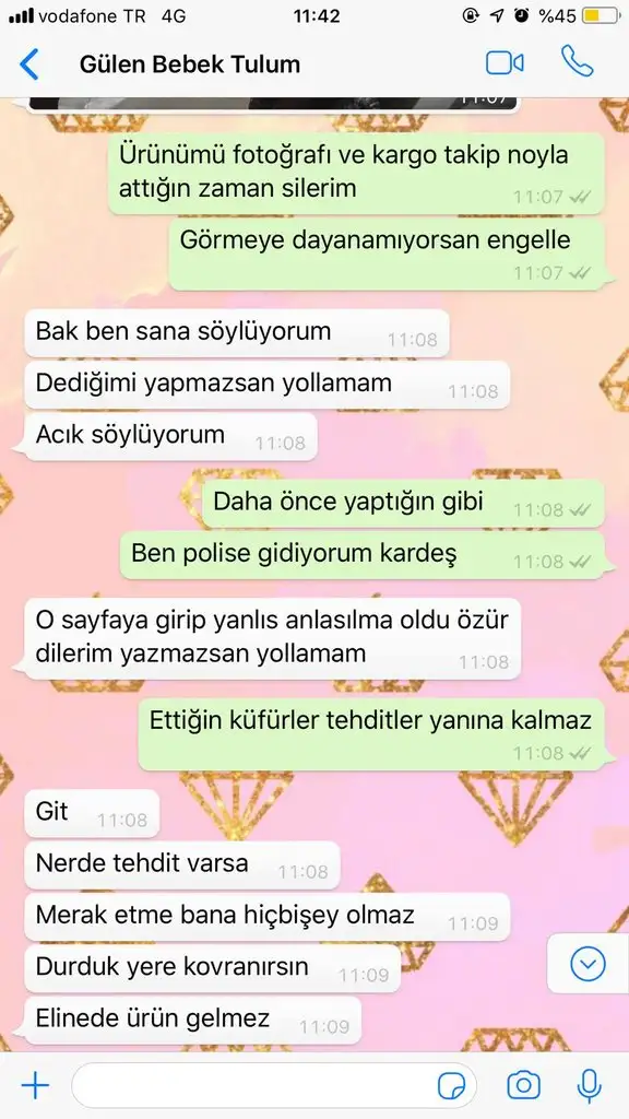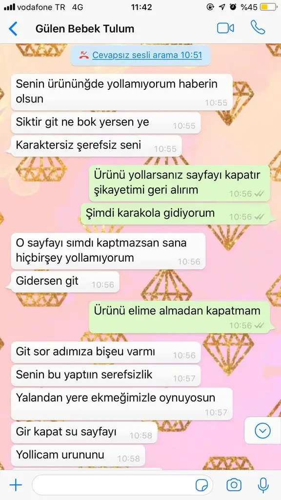 Her iki tarafın mesajını da okudum siz direkt paylaşmışsınız ama satıcı eksik paylaşım yapmış hatta bazıları ürünleri beğendiğini falan yazmış bazıları sizi haklı bulmuş. Hamile bir bayana bu şekilde konuşması son derece talihsizlik olmuş sonuçta kendisi satıcı ve parasını da peşin göndermişsiniz. Savcılığa gidip hakaret davası açabilirsiniz kesin kazanırsınız zaten.