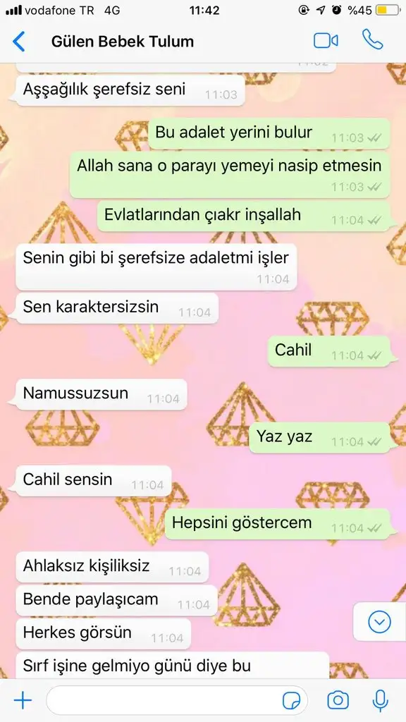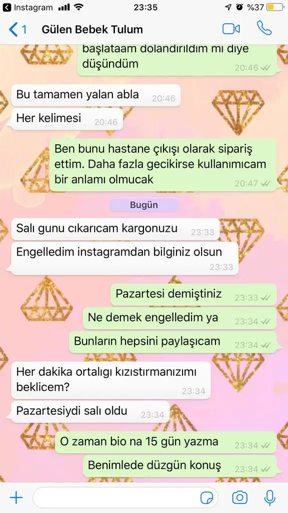 Ya fake hesap mı bilmiyorum ama bir tane kadın @gulenbebektulum sayfasına adamın paylaştığı konuşmalara “özel sipariş sonunda gecikebilir hiç sipariş vermedim ama sizi herkese tavsiye edicem allah bol kazanç versin’ yazmış. İnsanlar kör mü anlamıyorum. Adam kendi paylaştığı konusmada bile ürününü göndermiyorum vs yazmış. Hayret bişi ya🤦🏼‍♀️ Biride “Listenizdekilere tek tek takip isteği atıyor” falan yazmış. Ben başka insanları kandırmasın diye çabalarken insanların yaptığına bak. Bu adam gerçekten baba dolandırıcıymış. Yarın öbürgün ifade verirken polise ne dicek acaba. Bu ülkede artık dolandırıcılıkta alkışlanan legal bir durum olmuş vay halimize.