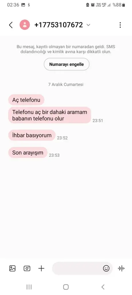 Mesajları kapatın, cevap vermeyin, telefonları açmayın. Emniyete gidip bilgi alabilirsiniz. Şikayet için illaki kimlik bilgisi bilmenize gerek yok onu emniyet bulacak. Korkmayın, ama bence emniyette bir şikayet kaydınız olsa iyi olur gibi geliyor bana. En azından babanı teröden şikayet edeceğim kısmında bu şikayetiniz elde bulunur iyi olur.Ablalarım 19 yaşındayım çok korkuyorum lütfen okuyun görsel de bırakacağım. Sosyal medyada profilimi gören herkes istek atıyor fake bir adam bana penisini atıp instadan beni arıyordu ben dayanamayıp ona küfür ettim o da özür dile yoksa evinde bomba var baban terörist diye ihbar ederim yazdı. Ben başta kale almadım ama babamın ve benim numaramı ve evimizin adresini bulup bana attı nasıl bulduğunu inanın hiç bilmiyorum. Numaramı bulunca beni gece 2 de ya da sabah 5 de fake numaralar satın alıp alıp rahatsız ediyor SMS falan atıyor ben engelledikçe yeni numara alıyor iki haftadır geceleri arayıp duruyor o kadar korkuyorum ki adamın elinde benim bütün bilgilerim var ama ben onun adını bile bilmiyorum. Babam savcılığa ben cimere yazdım ama sonuç gelmedi çünkü adama dair hiçbir şey bilmiyoruz hem bıktım hem korkuyorum hem sinirliyim işi gücü yok her gece beni arıyor napıcamı bilmiyorum