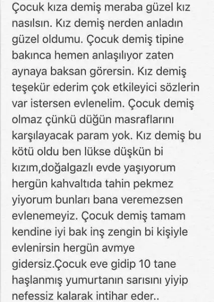Birşey anladıysam arap olayım. .Bızde olek barı bunlr ıcn olurmu yaben bosayasamısım xd benım annm ben 7yasomdaydım öldunde uvey anne elınde buyudum datak ezıyeto bıcım kolevzavra olduk sona lıse bıtızorlaıse sokuldum unı kazandm halde en sonunda gıne sınava gırdm kazndım calstm paralrı bırktrmıstm gızlıden gıttm okudum ordaesmle tanıstm 8 yılk nı beraberlıkos gucderkn evlılk sabretmyı bılmk gerkıo hep sole avundm allah sevdı kularına dertverrmıs dıe sabretm savastm asla lanet etmedım kader rabım bole uygun gormus bunu kımse sınayamaz kul olrak rabımın verdı canı rabımden baskası alamazz , .... Allah tardmcın olsunda don sacma fıkrınden