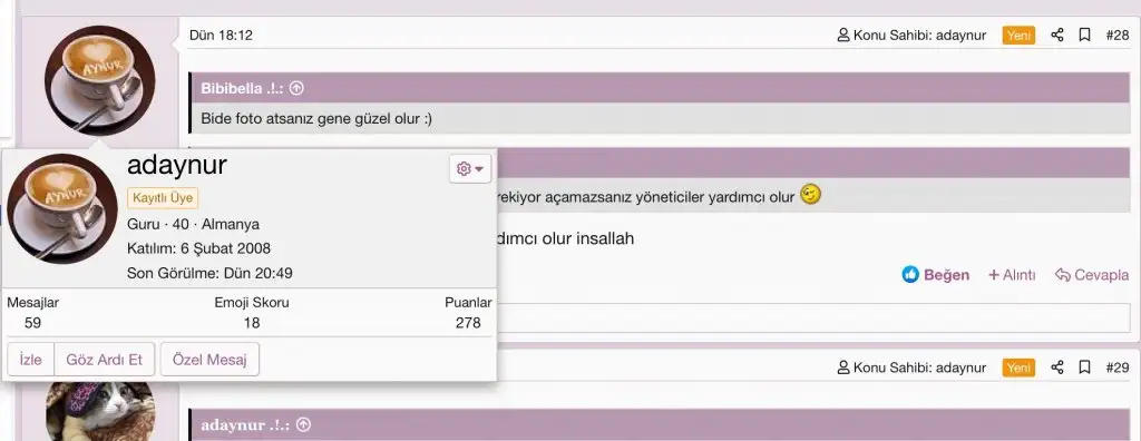 Güncelleme yapalım, özel mesaj göndermek istediğiniz kişinin görseldeki gibi kartviziti çıkmıyor göremiyorsanız, üyenin profiline tıklayın, bunun için burada yazan üyelerden kime mesaj gönderecekseniz onun kullanıcı adına tıklamanız gerekiyor, üyenin profil sayfası açılır.Merhaba,
