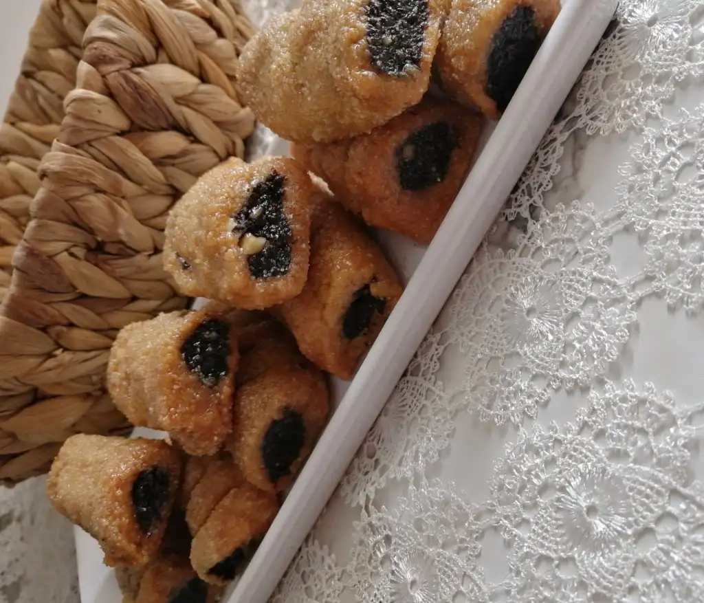 Hazır olan sade hamuru uzunlamasına sçıyorız içine silindir haline getirdiğimiz kakaolu harcımızı ekleyip sirindir haline getiriyoruz üzüne çizikler yapıp irmiğe buluyoruz