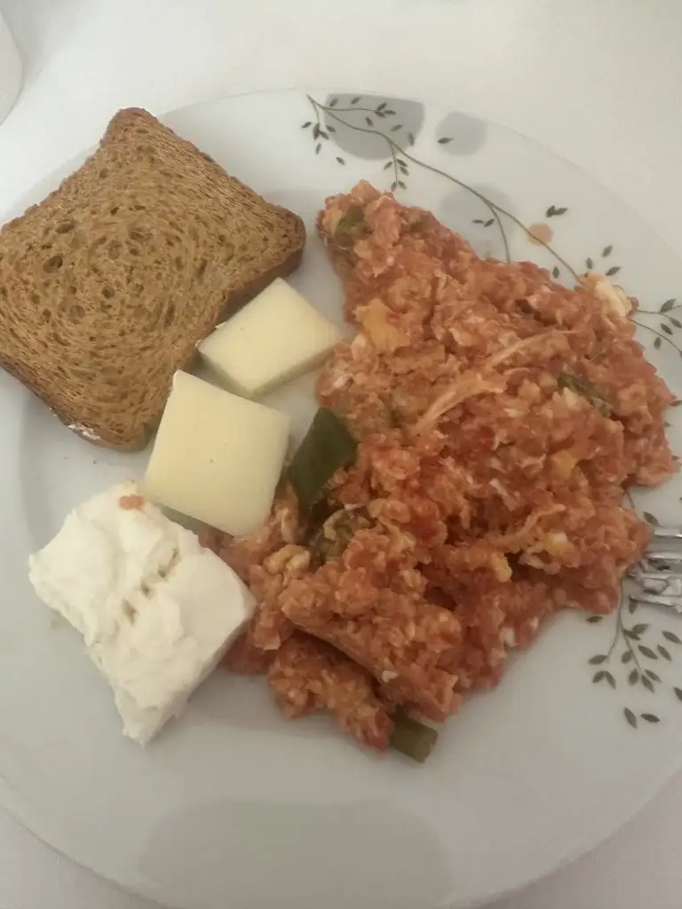 Ben 12-7 arası yediğim için yeni kahvaltı yapıyorum, sabah filtre kahve içtim, bugun normal kahvaltı yapıyorum hindi fümeli yumurta, domates peynir salatalık zeytin ve yanına şekersiz çay, 1 dilim de ekmegim var , ekmegi sabah kahvaltısında yiyorum birtek ondan vazgeçemiyorumhindi fümenin protein oranı yüksek oyuzden kahvaltıda onu da sık kullanıyorum