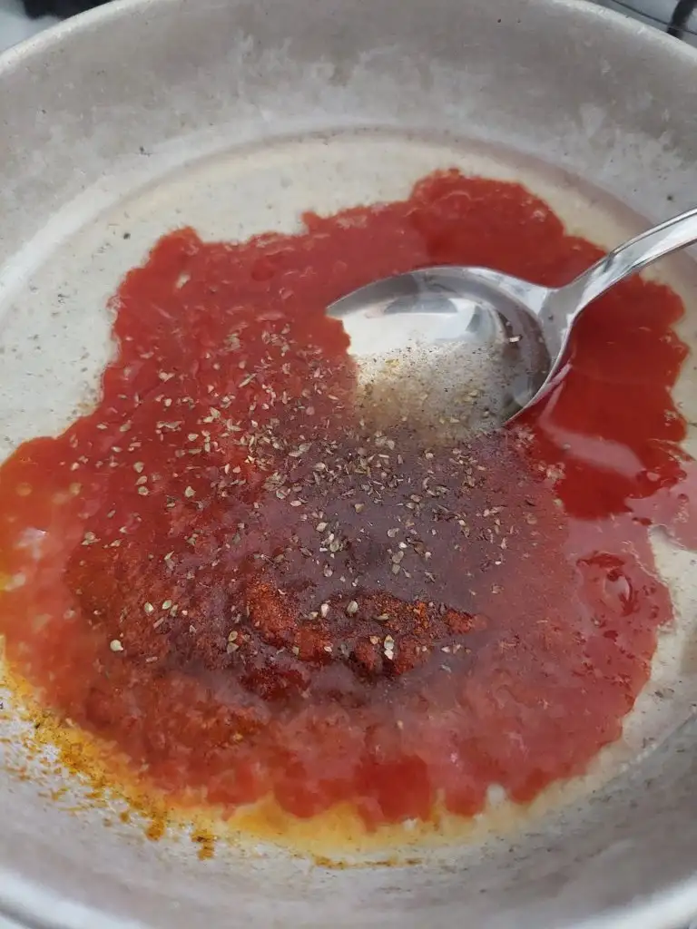 Tavaya 2-3 yemek kaşığı sıvıyağ koydum .Salça biraz kavrulunca baharat ve su ekleyip 2 dakika kaynattim . Baharat olarak kırmızı toz biber,karabiber ve kekik ekledim