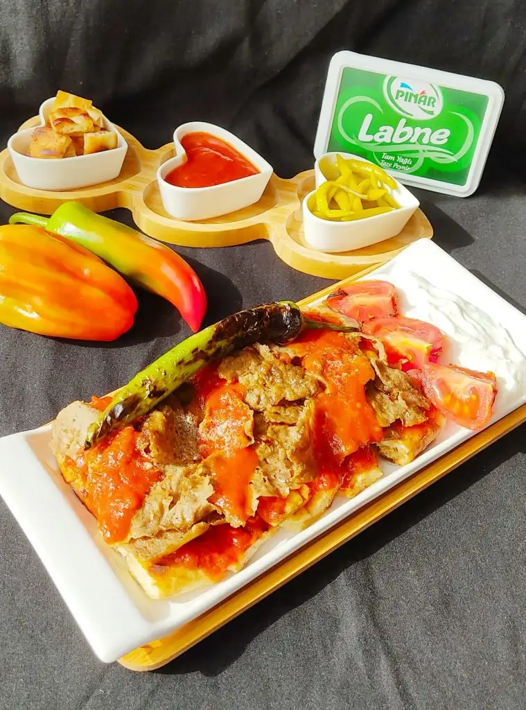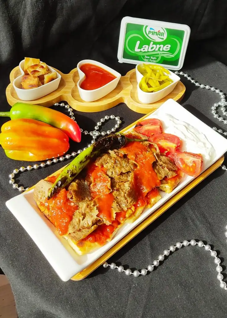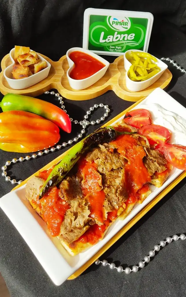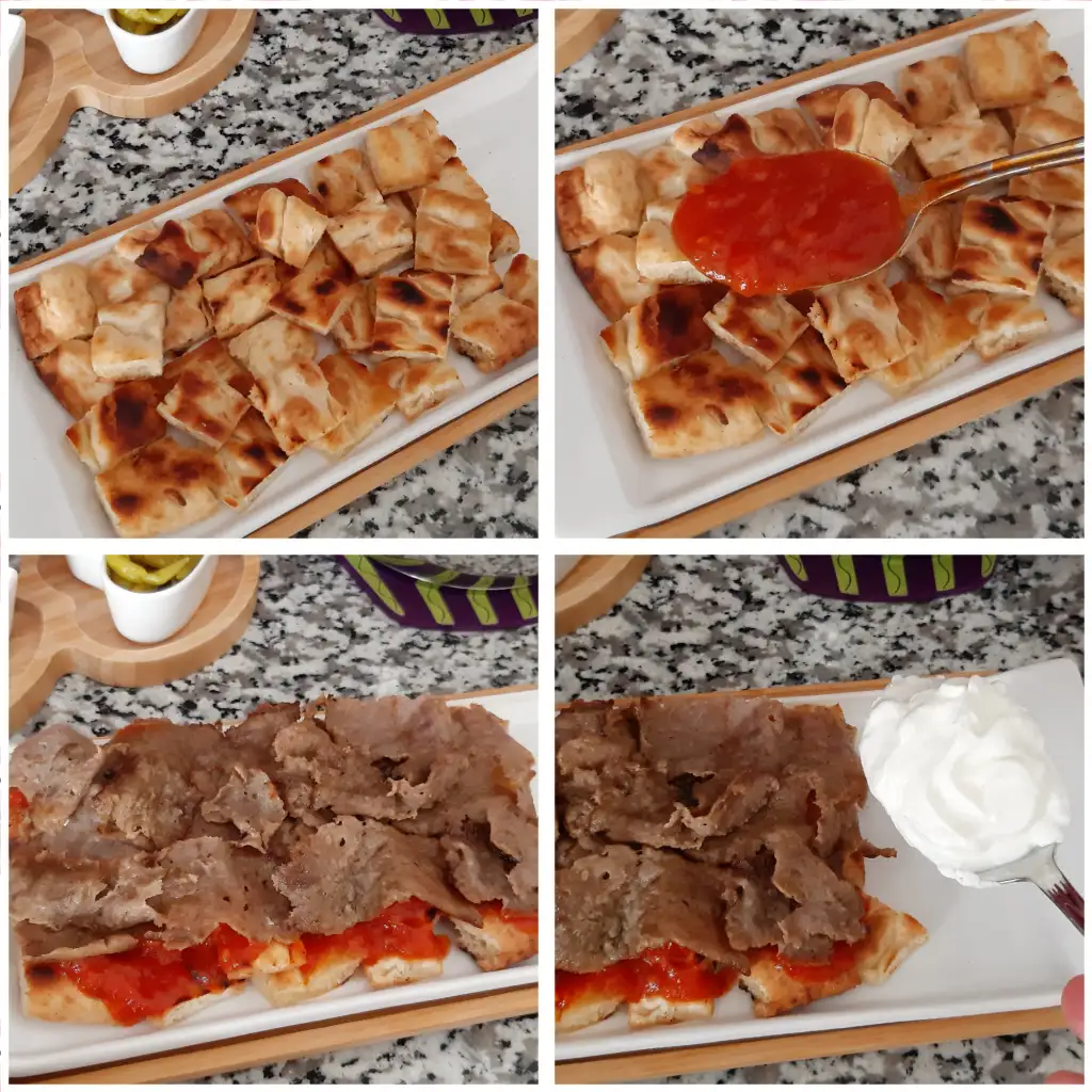 Pideleri tabağa dizelim, üzerine sosumuzu gezdirelim, üzerine et dönerimizi yerleştirelim, üzerine tekrar sosumuzdan gezdirelim, kenara labneli yoğurdumuzu koyalım, köz domates ve biberimizi tabağımıza yerleştirelimm vee son dokunuş cossss😂😂😂💃💃💃💃