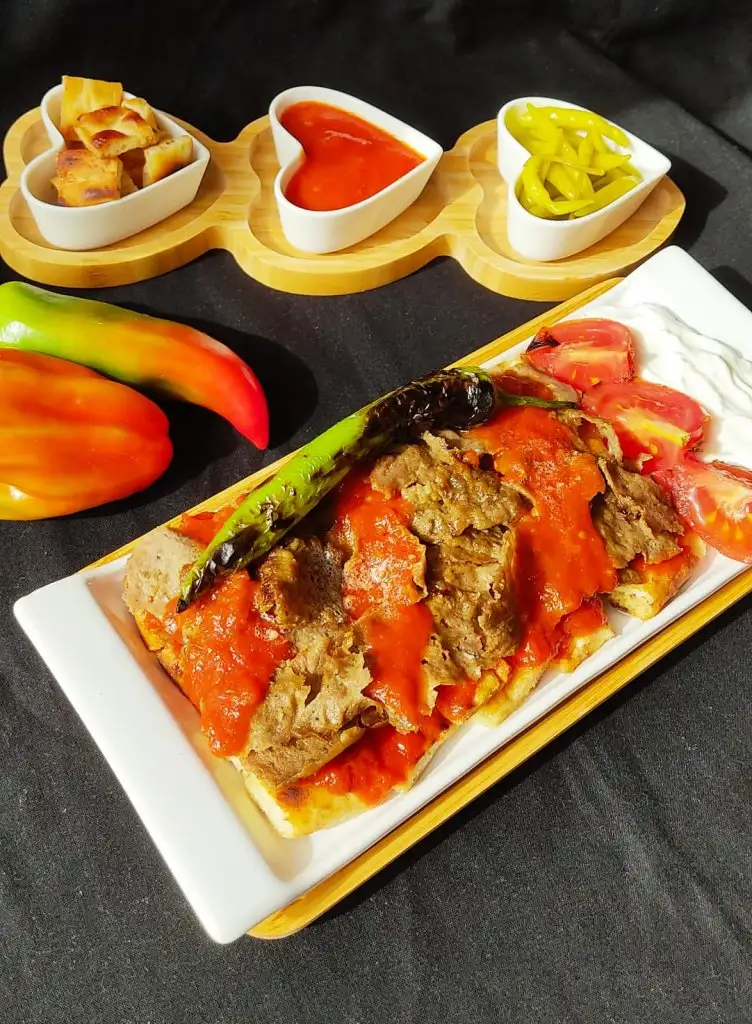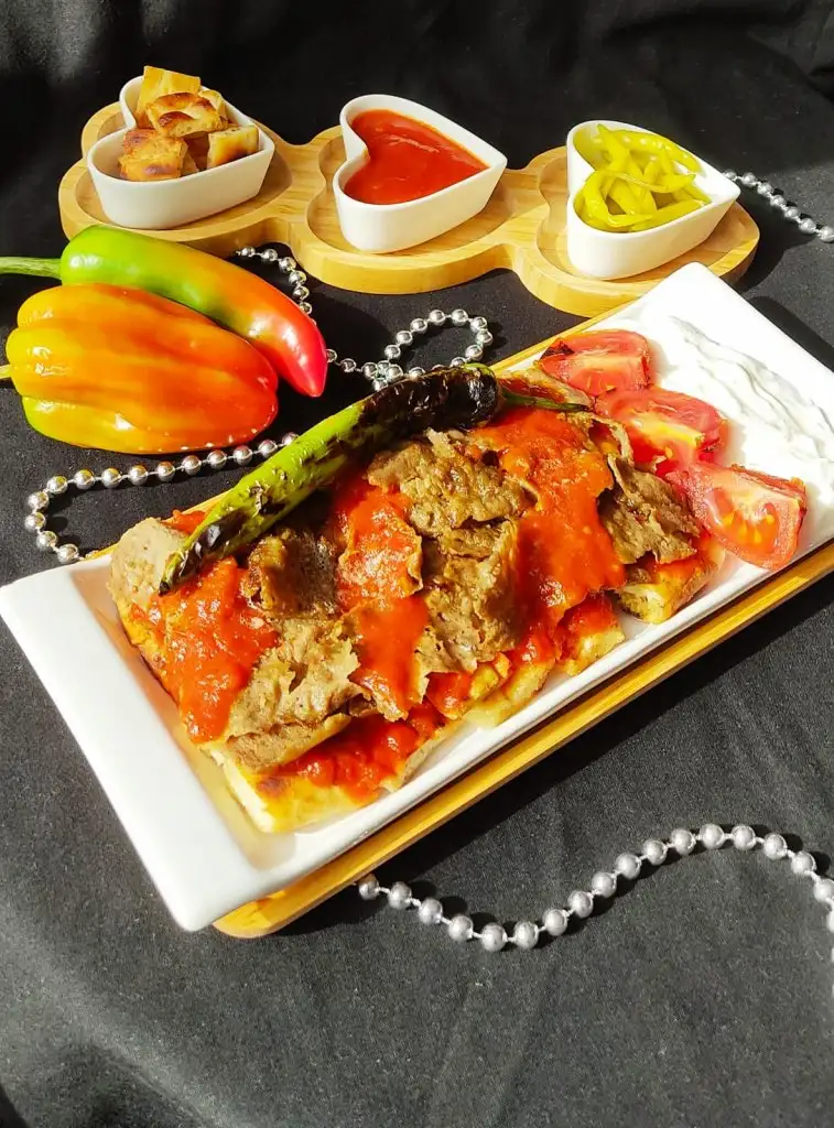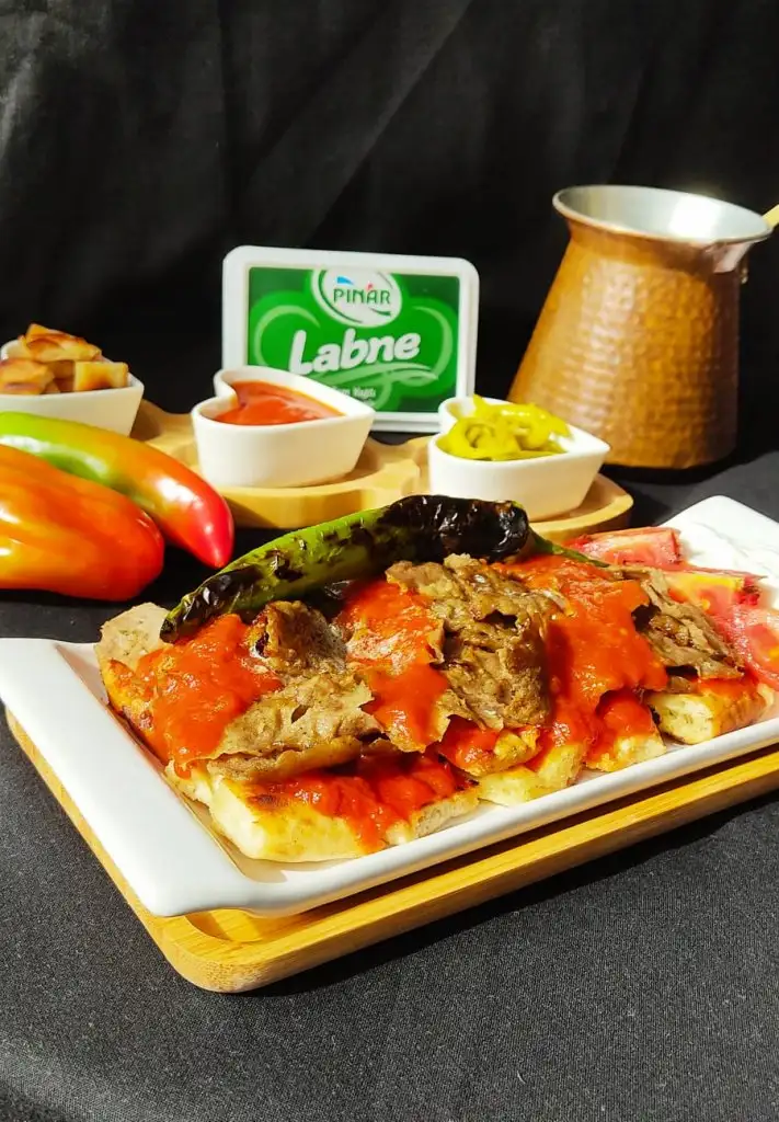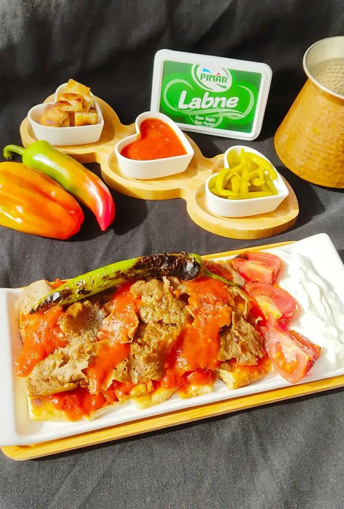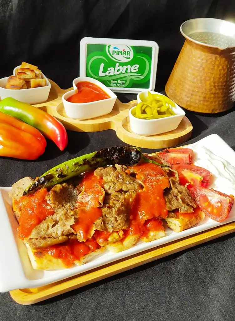Pideleri tabağa dizelim, üzerine sosumuzu gezdirelim, üzerine et dönerimizi yerleştirelim, üzerine tekrar sosumuzdan gezdirelim, kenara labneli yoğurdumuzu koyalım, köz domates ve biberimizi tabağımıza yerleştirelimm vee son dokunuş cossss😂😂😂💃💃💃💃