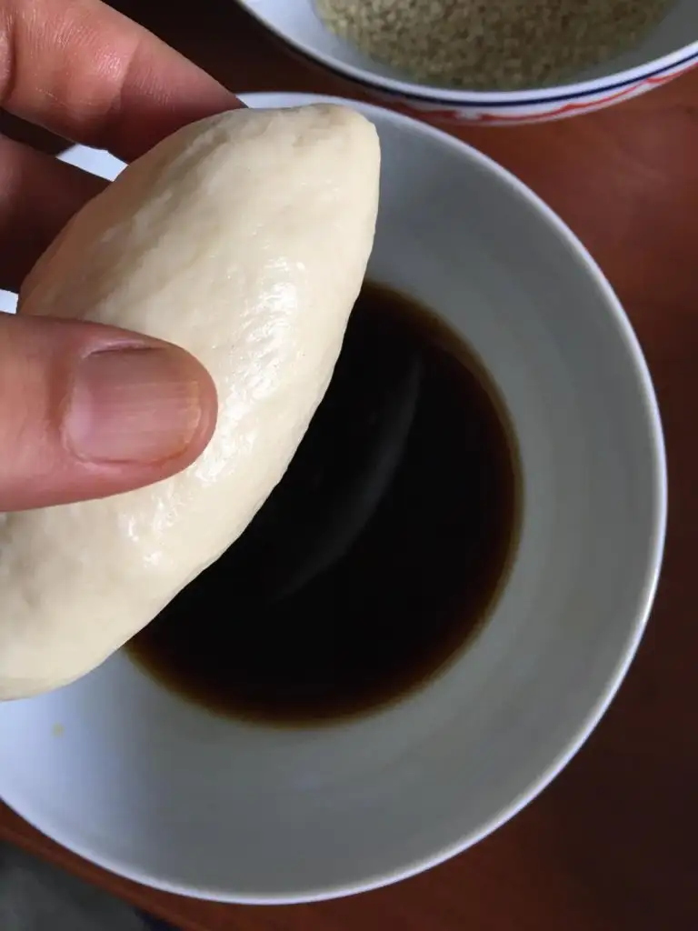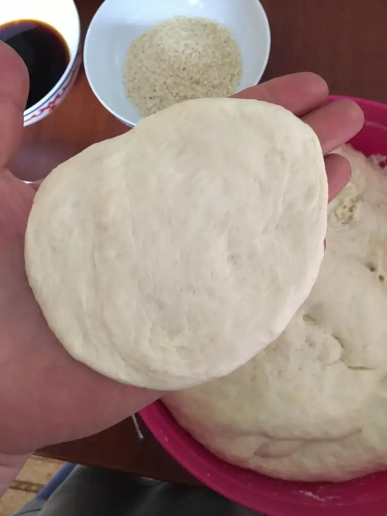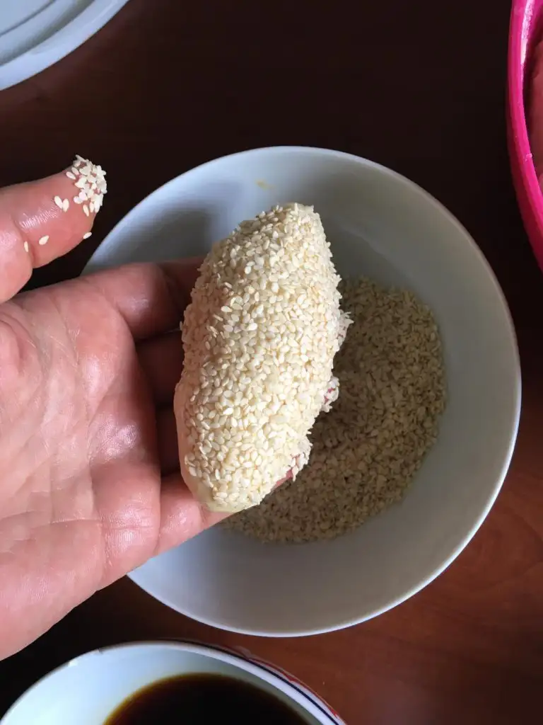 Önce pekmez şerbetine bulayıp, susamda döndürelim.