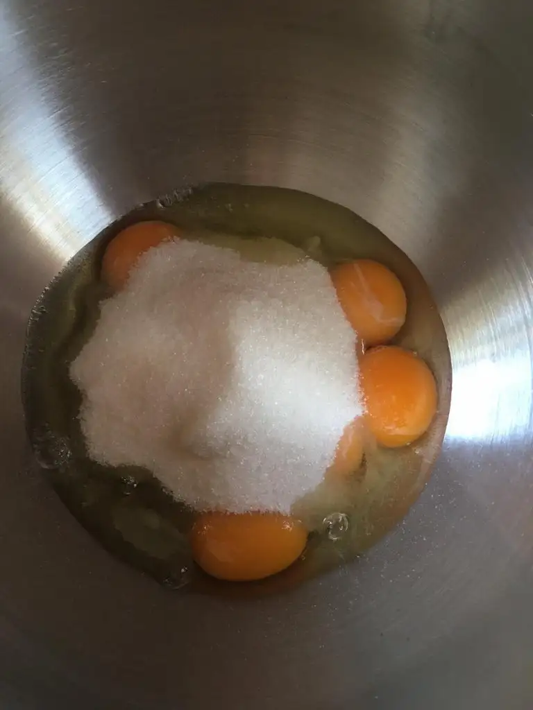 Yumurta ve şekeri kabımıza alıp mikserin yüksek devrinde 5-8 dakika arası köpük köpük olana kadar çırpıyoruz.