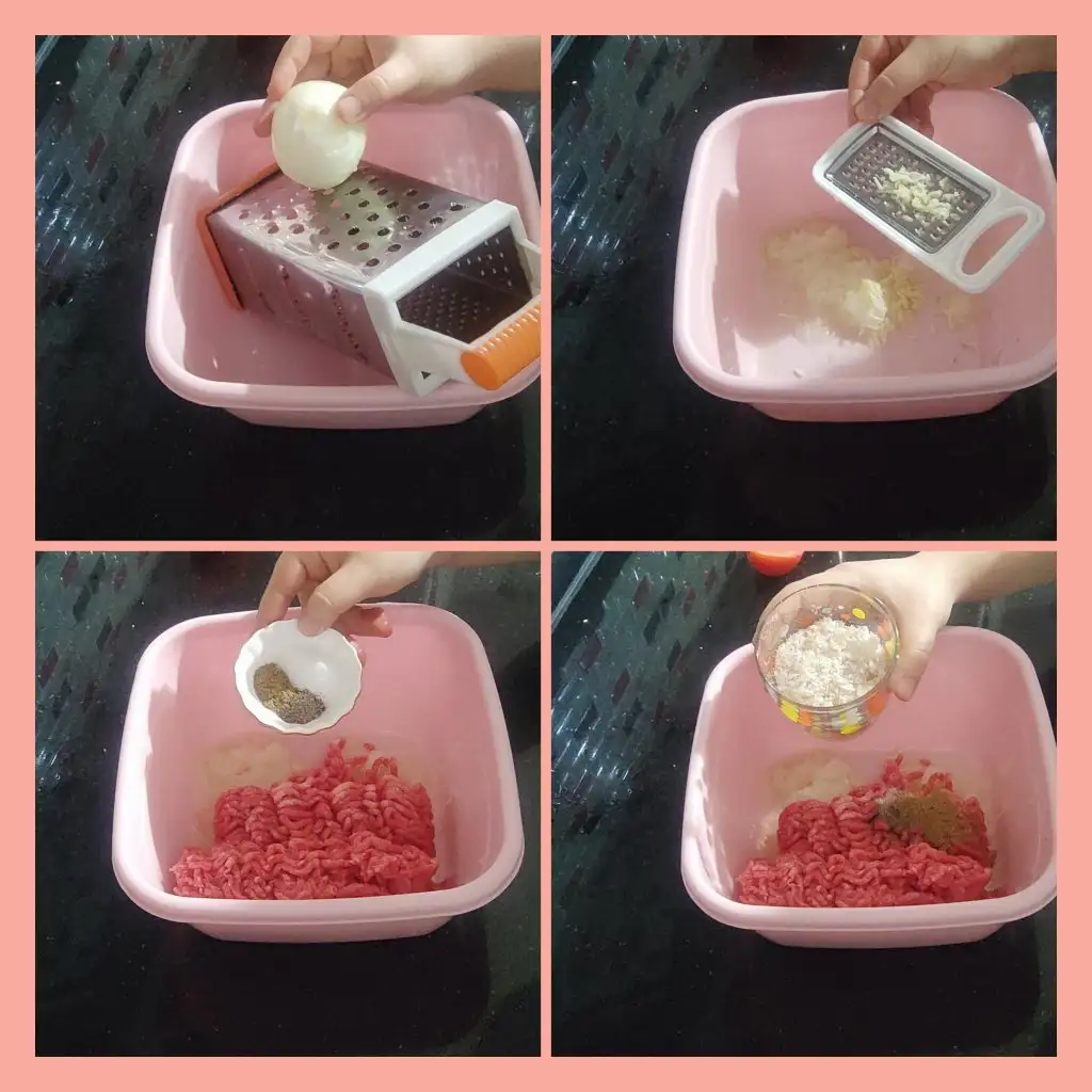 Şimdi yapım aşamasına gelelim. Öncelikle köfte malzemelerimizi bir kaba koyup yoğuralım.
