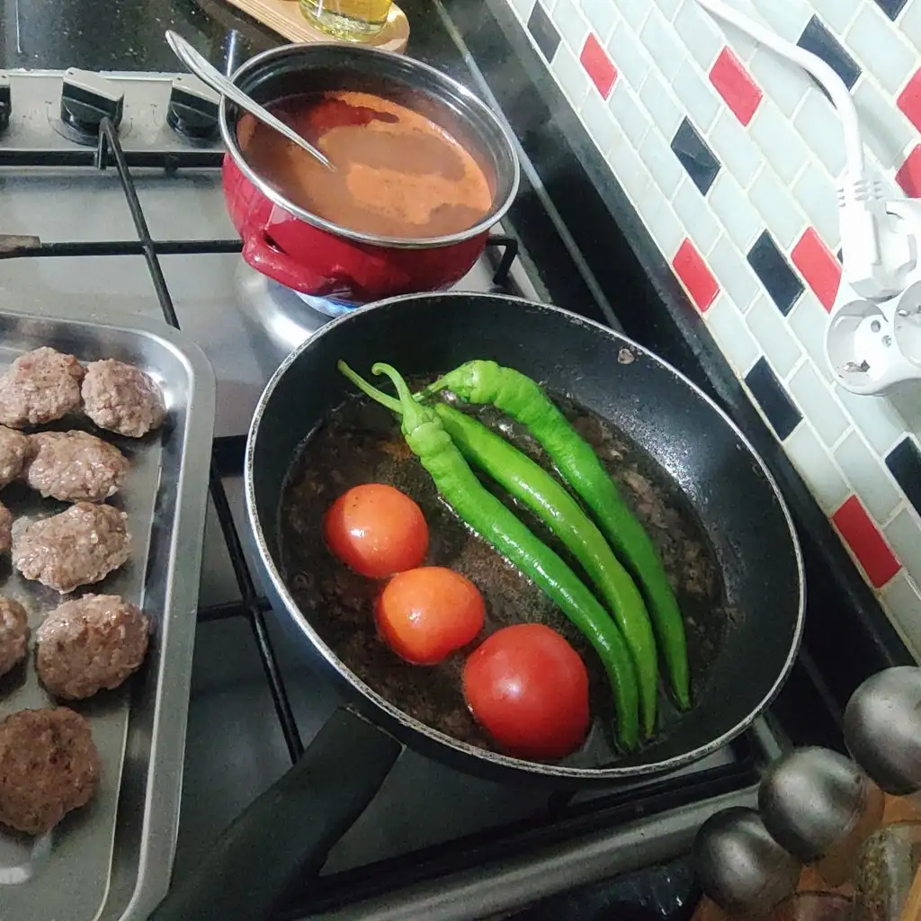 Köfteler kızarınca aynı tavada biber ve domatesleri kızartıyoruz.