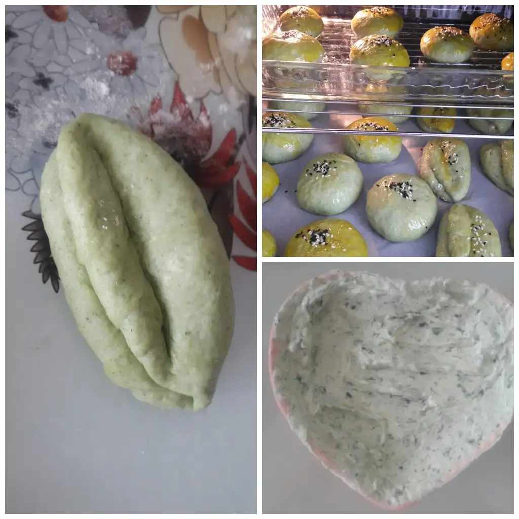 🍀Ilıyan poğaçaları bıçakla hafifçe yarıya kadar keselim ve sıkma torbasına aldığımız ıspanaklı labneden enjekte edelim 😬