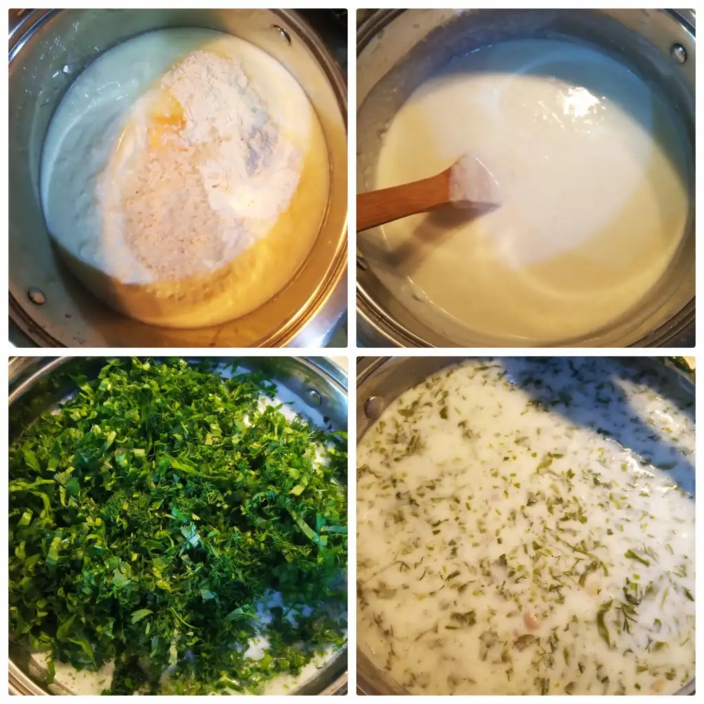 Bir diger tarafta yogurdu yumurtani unu pirinci bir tencereye alip cirpin.ocaga koyun karistirmaya baslayin biraz iliyinca karistira karistira sicak su ilave edin.bu corbanin puf noktasi hic durmadan kaynayana kadar tahta kasikla karistirmaniz gerekiyor.yoksa kesilir.corbamiz kaynayinca yesillikleri ilave ediyoruz ve en son nohutu da ilave edip altini kapatiyoruz.corbanin altini kapattiktan sonra tuzunu dokuyoruz.ve corbamiz hazir