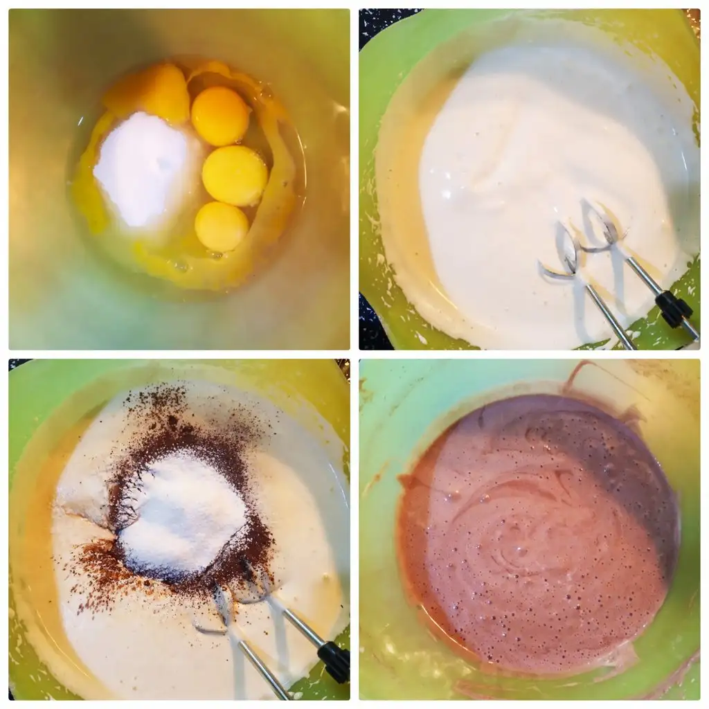 - Yumurta ve şekeri köpürene kadar çırpıyoruz ,içine elenmiş kakao, un, kabartma tozunu koyuyoruz.