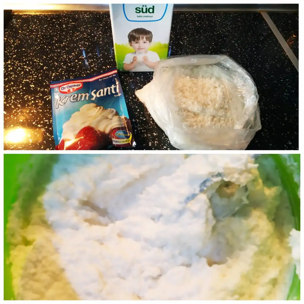 - Kokostar kısmı için krem şantiyi sütle çırpıp içerisine hindistan cevizini koyuyoruz, pudra şekerini de ekleyip karıştırıyoruz.