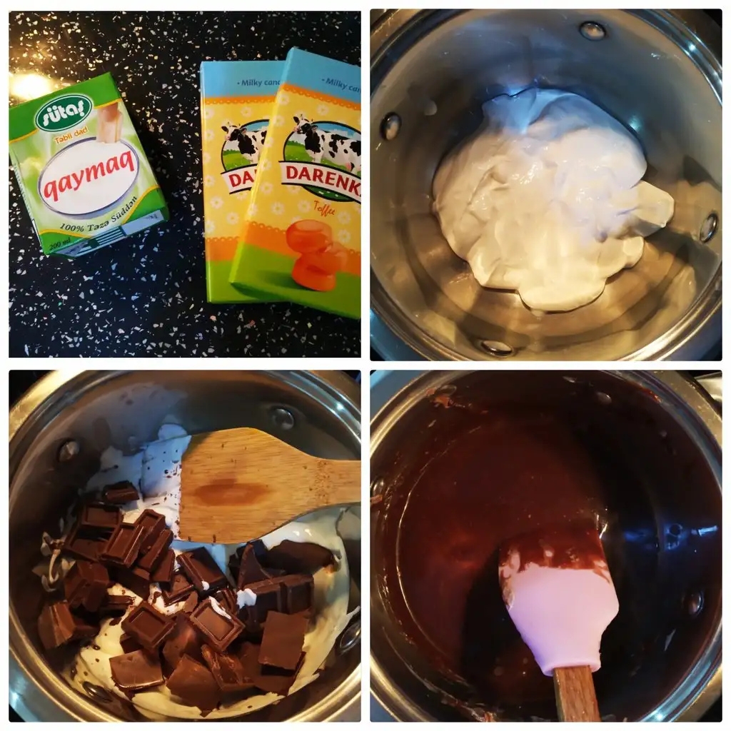 - Ganaj için kremayı bir tencereye alıp kaynama noktasına gelene kadar ısıtıyoruz, altını kapatıp içine çikolataları koyup karıştırıyoruz.