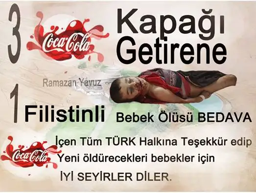 bizler de en az israil kadar suçluyuz.....EFENDİMİZ BUYURUYOR:ZULME SESSİZ KALMAK DA ZULME ORTAK OLMAKTIR.ZULME SESSİZ KALMA,diye buyuruyor....ama biz elimizden geleni bile yapmıyoruz.......Bende destekliyorum kola zaten içmiyorum ama sanırım en sıkıntılı ürün o olsa gerek. Ülkemizde insanları koladan vazgeçirmek çok zor . Diğer ürünlerin alternatifi var ama nedense coca coladan başkasını pek içmiyorlar.