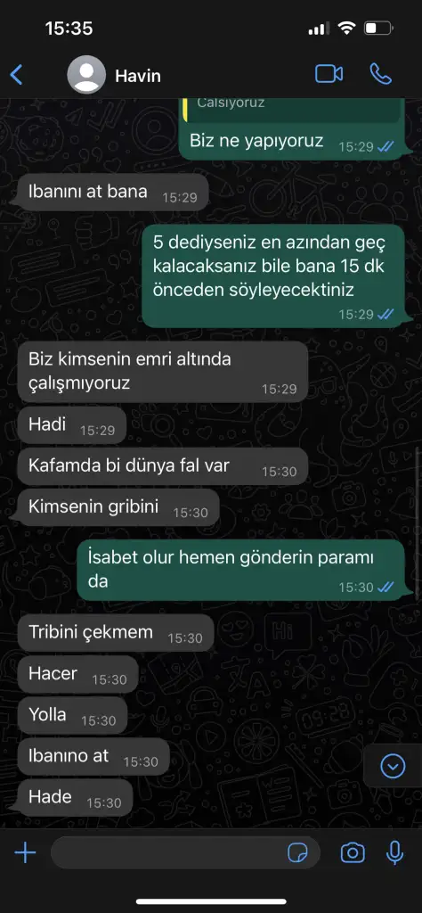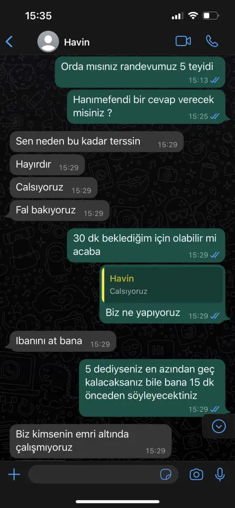 Herkese merhaba buraya çok az insan hakkında yorum yazmışımdır aratabilirsiniz falları çoğunun çıkmamış olmasına rağmen en fazla dedikleri olmadı diyip geçmişimdir. Fakat bugün fazlasıyla TERBİYESİZ ve HADSİZ birini burda belirtmek isterim ki böyle terbiyesizlere paramızı kaptırmayalım. Yurtdışında yaşıyorum ve Türkiye ile aramda 2 saat fark var dün akşam için Türkiye saatiyle 5 te bakım HAVIN adındaki falcıdan randevu aldım. Gördüğünüz gibi buranın saatiyle 3 de Türkiye saatiyle 5 te parasını gönderdim ve mesaj attım attığım mesajlara cevap germedi aradım kapattı ve geri dönüş yapmadı. 30 dk sonra hanımefendi cevap verecek misiniz mesajına verdiği cevap bu. Yavuz hırsız ev sahibini bastırırmış bu olsa gerek! Herkes çalışıyor ve herkesin bir programı var eğer 5 te uygun olamayacaksan bana haber vereceksin!!! Öyle kafana göre yarım saat sonra cevap veremezsin hadi cahilliğinden vermedin haber yazdığım da kusura bakmayın bir 20 dk geç başlayabilir miyiz diyeceksin ! Bu mesajın bir şekilde sana geleceğini de çok iyi biliyorum. Dua et parayı hemen gönderdin yoksa senle fena uğraşırdım!!!